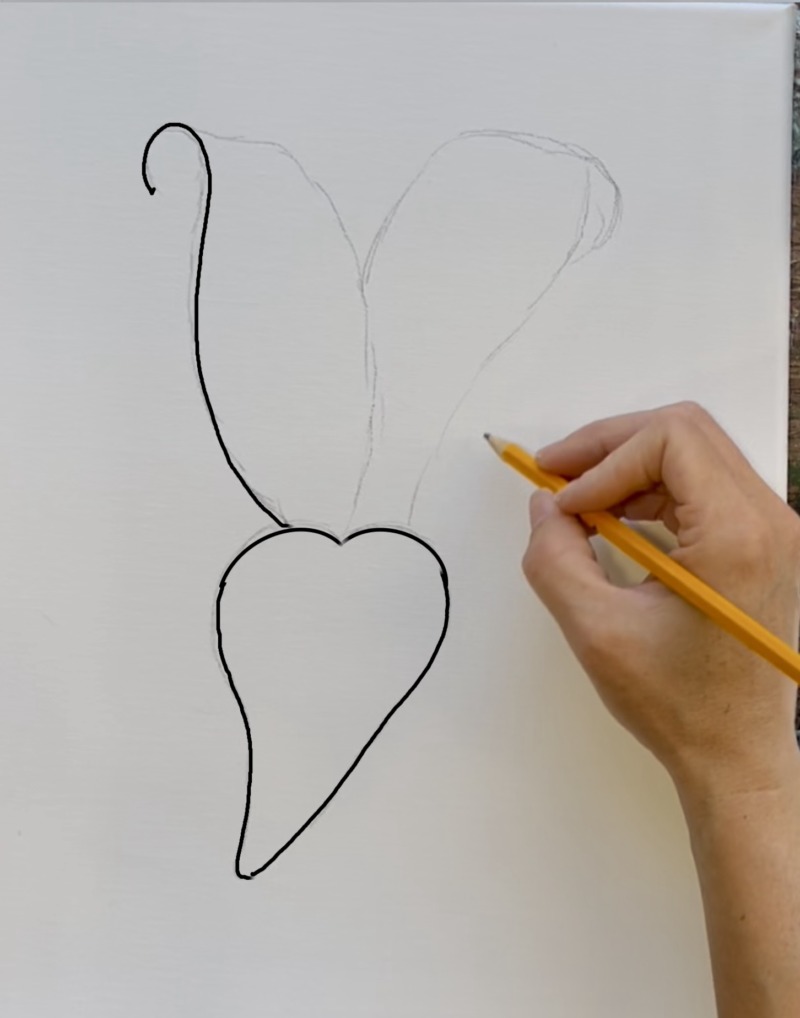 Use a pencil to lightly sketch the petals of the lily. Start with the bottom front petal. The shape is almost like a heart shape but elongated and slightly bent to the left. Start in the middle of your canvas for this first petal. Leave a little room on the bottom for the stem and leaves.