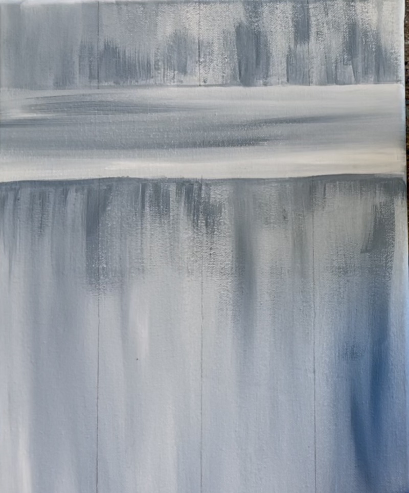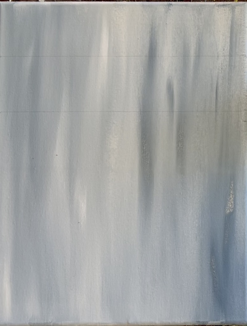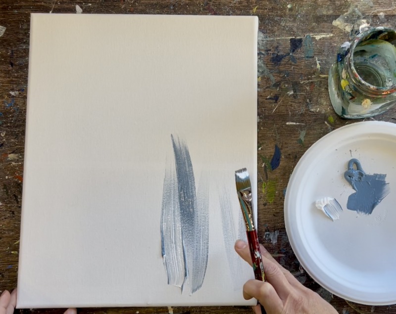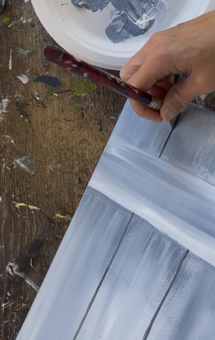 Load your paint palette with the two colors: “blue gray” and “titanium white”. Use the 3/4″ flat wash brush and double load it into both the gray and the white. Then paint up and down paint strokes and blend the two colors slightly together. Slightly water the paint down so this layer is a thin consistency.