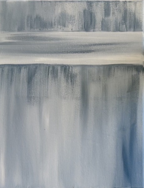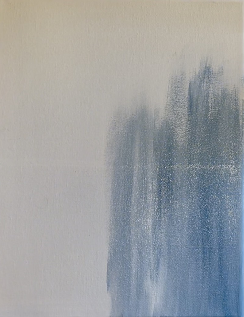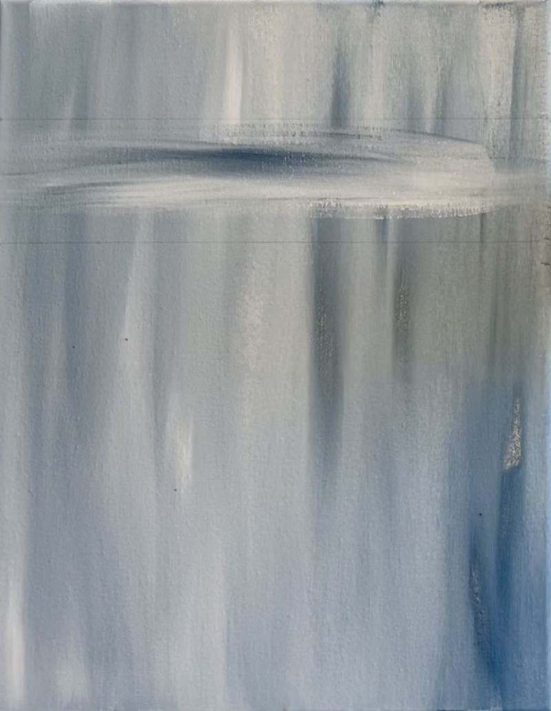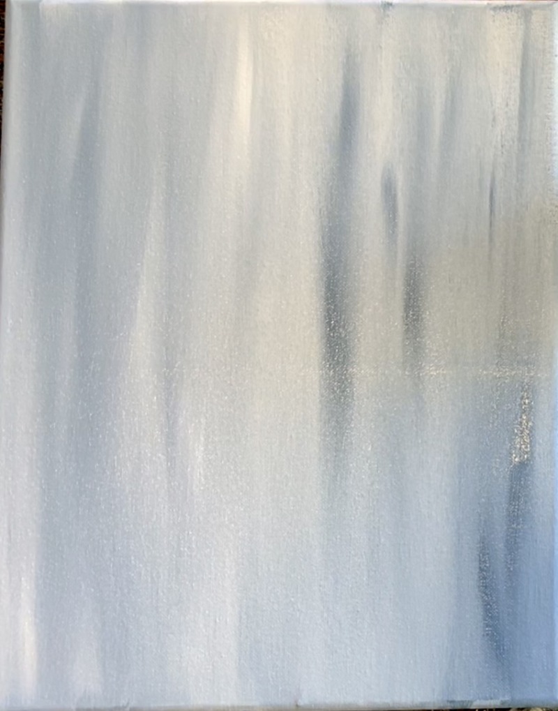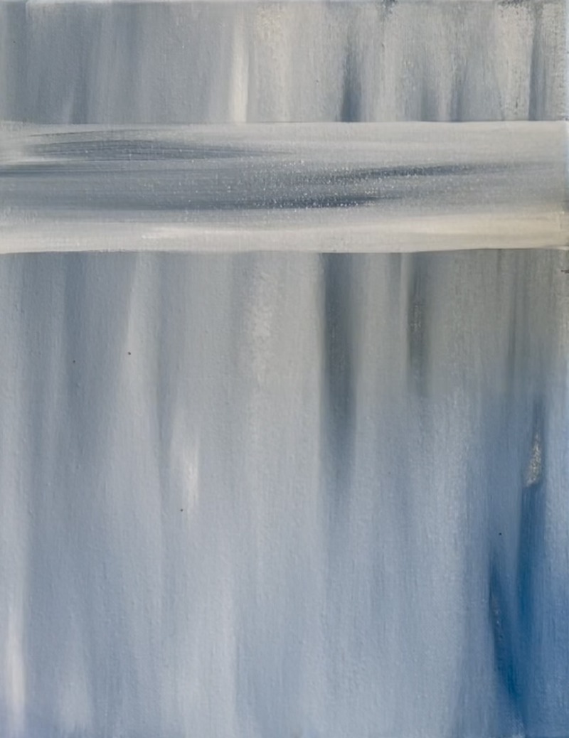 Load your paint palette with the two colors: “blue gray” and “titanium white”. Use the 3/4″ flat wash brush and double load it into both the gray and the white. Then paint up and down paint strokes and blend the two colors slightly together. Slightly water the paint down so this layer is a thin consistency.