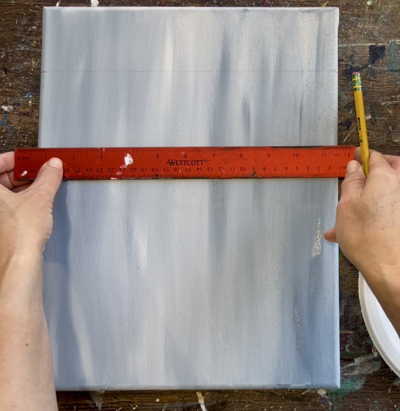 Wait for this to dry a bit. Then take a ruler and measure 2.5″ down (or estimate this) and draw a horizontal line. Then draw another line at about 2.5″ below that line. This will create the shape for the “horizontal beam” in the background.