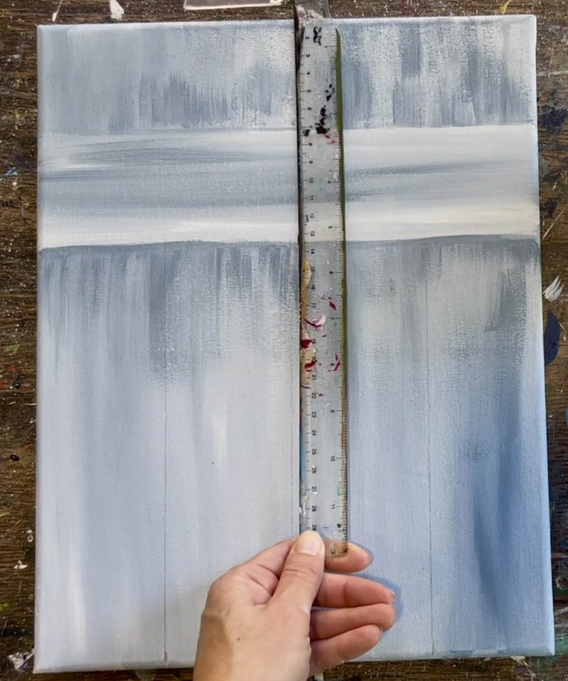 Let this dry a bit. Then use a ruler to draw vertical lines, dividing the background into 4. Draw a line right down the middle. Then draw two more lines on each side of that for a total of 3 vertical lines. Don’t draw the line over the horizontal beam.