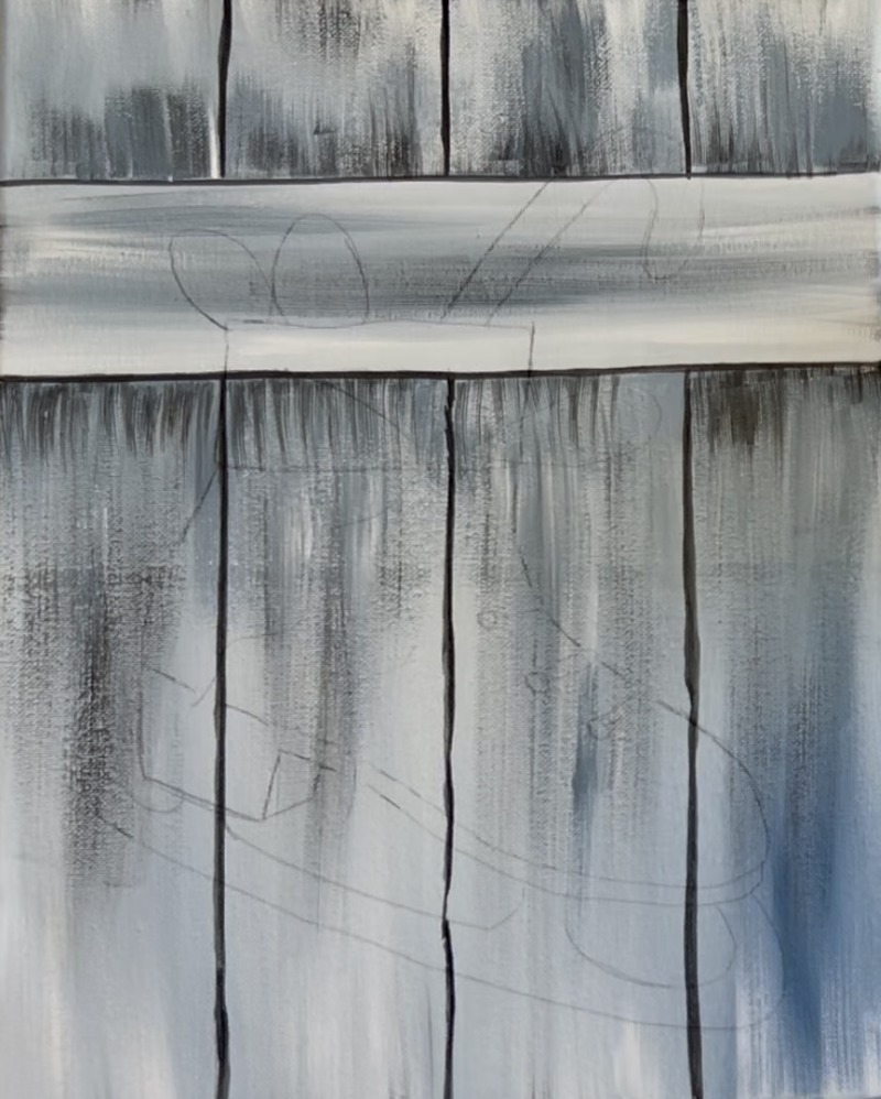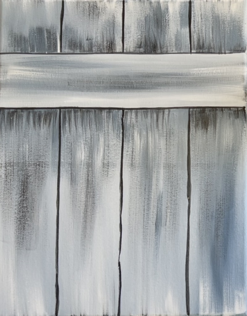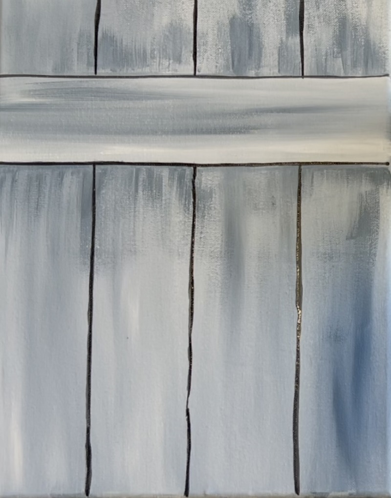 Optional: add “dry brush strokes” with more of the “blue gray”. Use the full width of the 3/4″ flat brush and drag vertical paint strokes above and below the horizontal beam to create some “shadowing”.