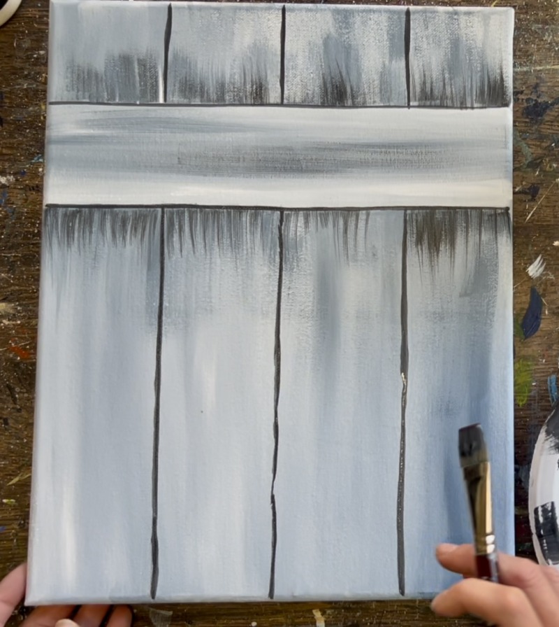 Use the 3/4″ flat brush and mix together equal parts “mars black” and “blue gray”. Use the edge of the brush to paint the vertical lines to create the gaps between each of the vertical wood boards.