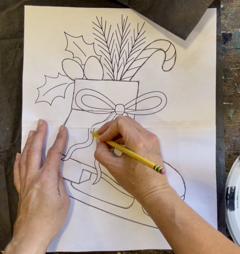 Print the template and tape the two sheets together. Place a sheet of graphite paper below the template. Position the skate so that it is on the canvas and centered (the paper should be exactly 11 x 14 but you can adjust the position on the canvas if needed). Then firmly trace the design so that it transfers to the background.