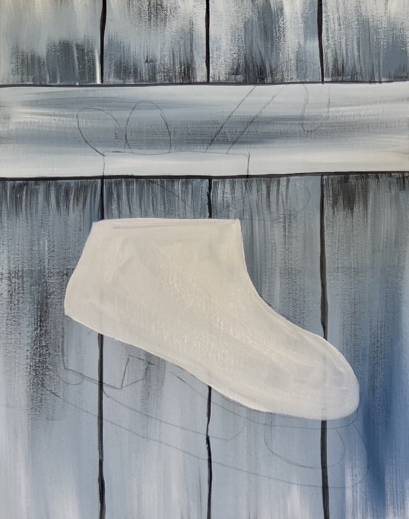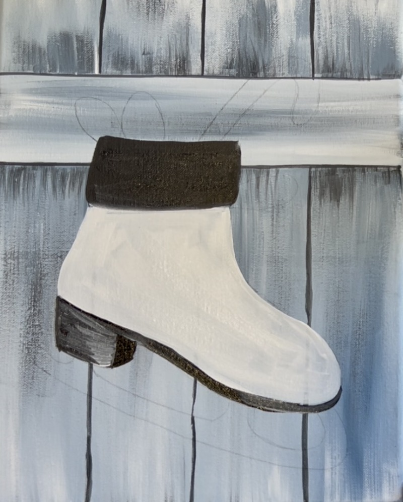 Use the #12 bright brush and “titanium white” to paint the white part of the skate. This is the majority of the boot. Your white layer should be relatively thick. If there is background showing through, you can go back over it with a second layer.