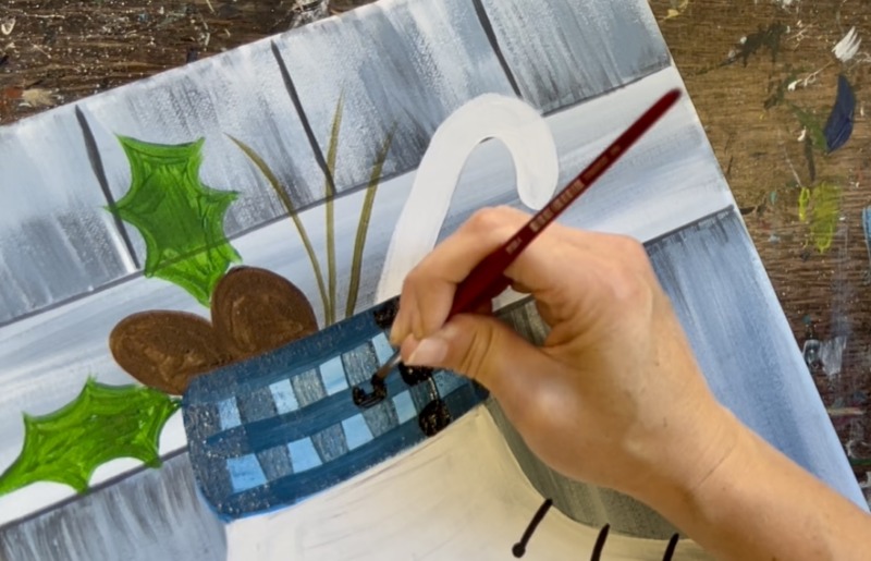Painting the black squares will complete the plaid pattern! If needed, go back and re-paint the light blue squares so they show up brighter.