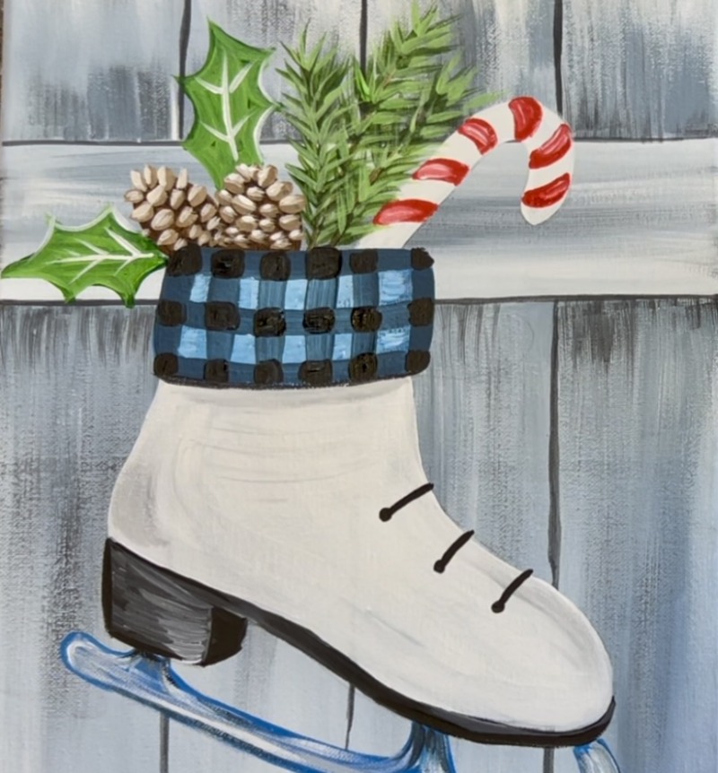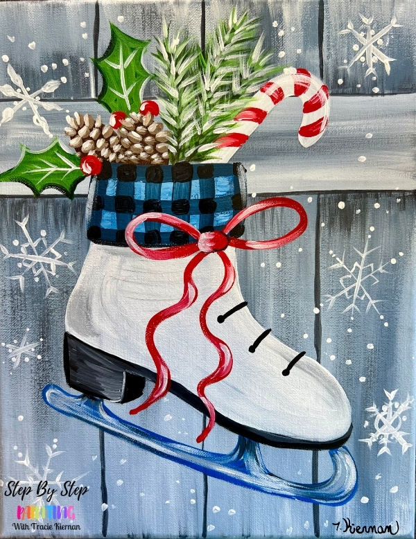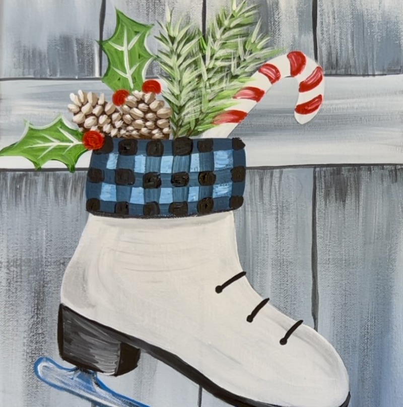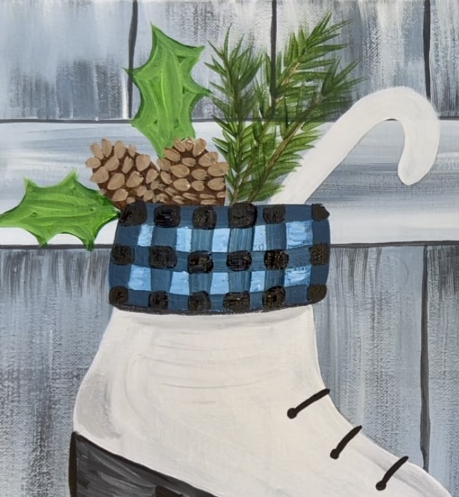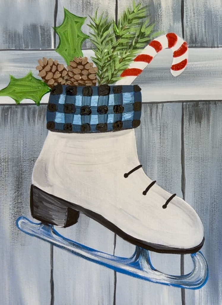 Celebrate the season with this fun and festive beginner-friendly painting! In this tutorial, you’ll learn step-by-step how to paint a classic white ice skate filled with holiday greenery, pinecones, and candy canes — all set against a snowy, wood-textured background. We’ll practice simple brush techniques to create plaid patterns, pine needles, and soft snowflakes, perfect for adding cozy winter charm.