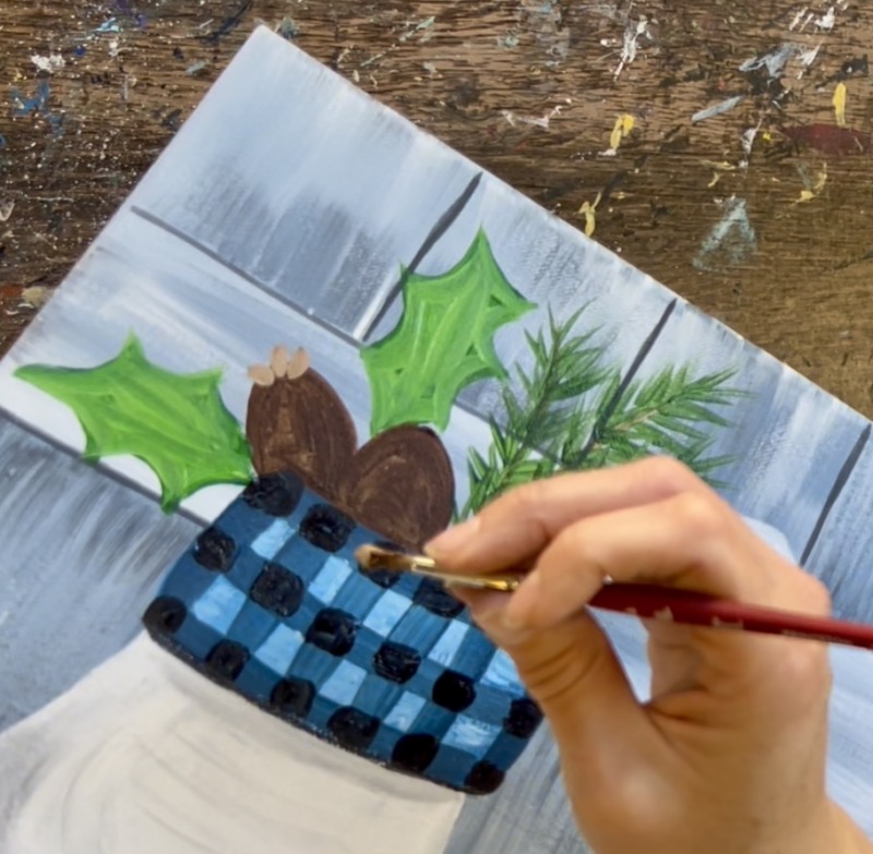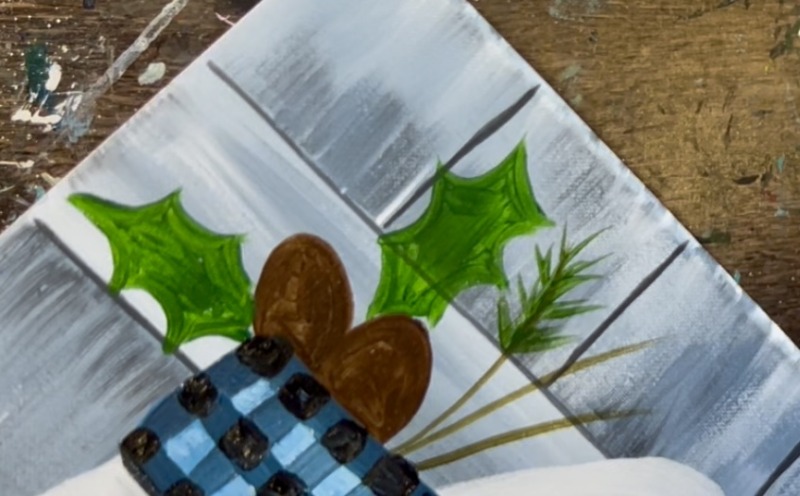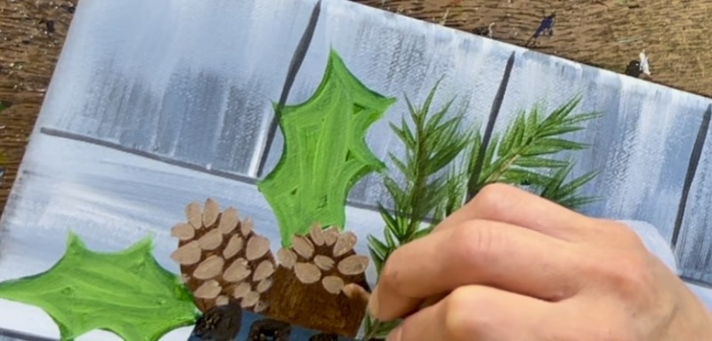 Use the color “hooker’s green hue” to paint the holly leaves. Then paint the branches for the pine branches. Mix equal parts “hooker’s green hue” and “burnt umber”. Then paint the three thin lines for the branches using the #4 round brush.