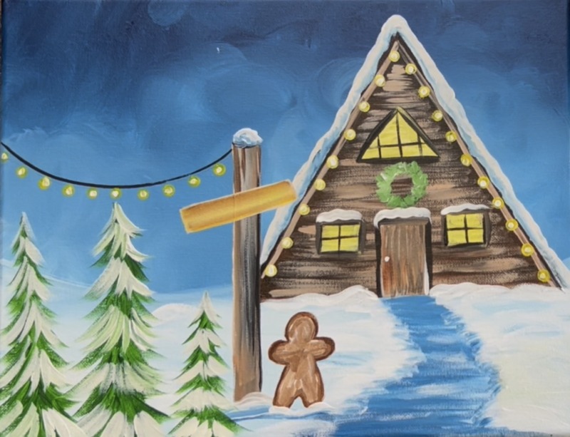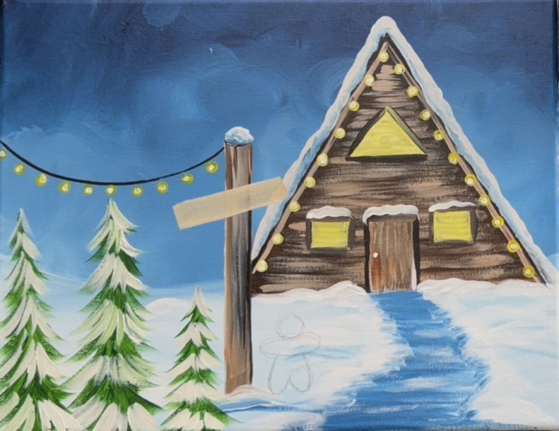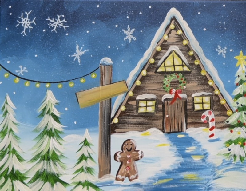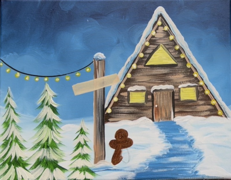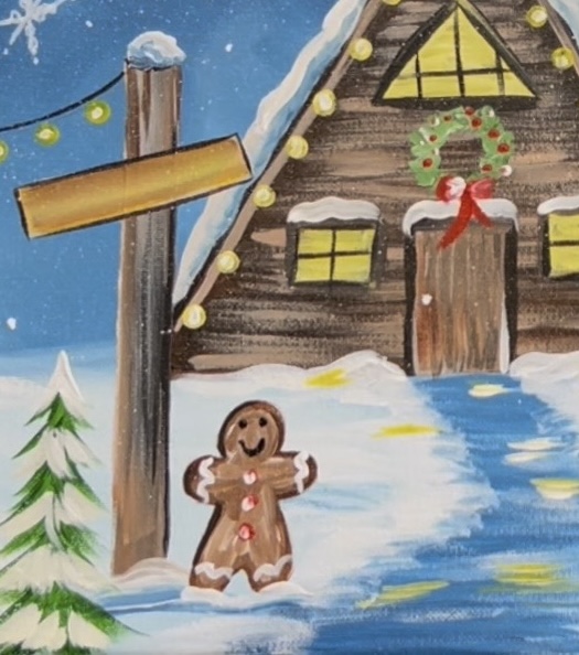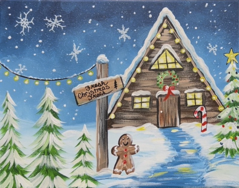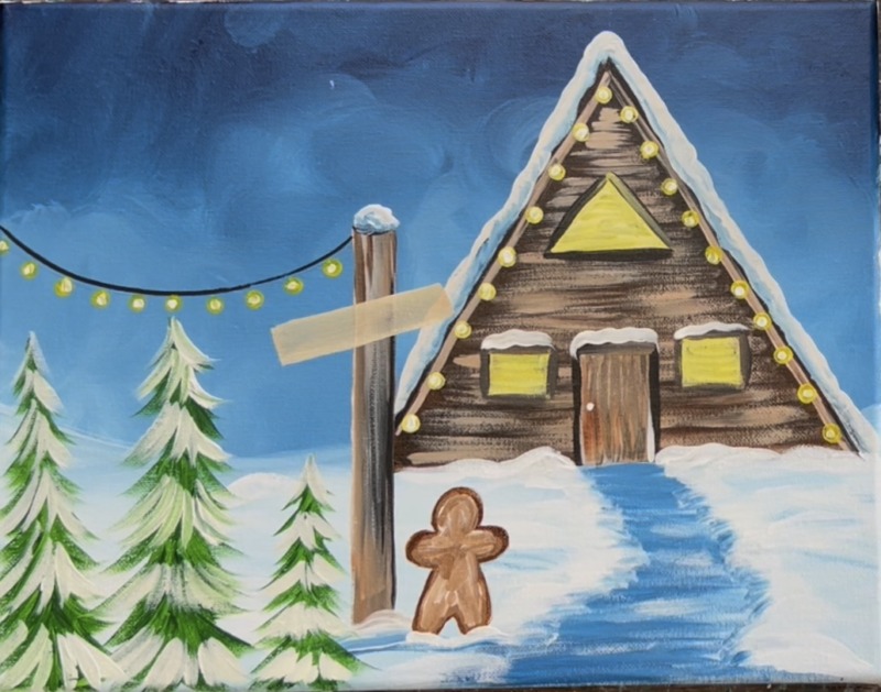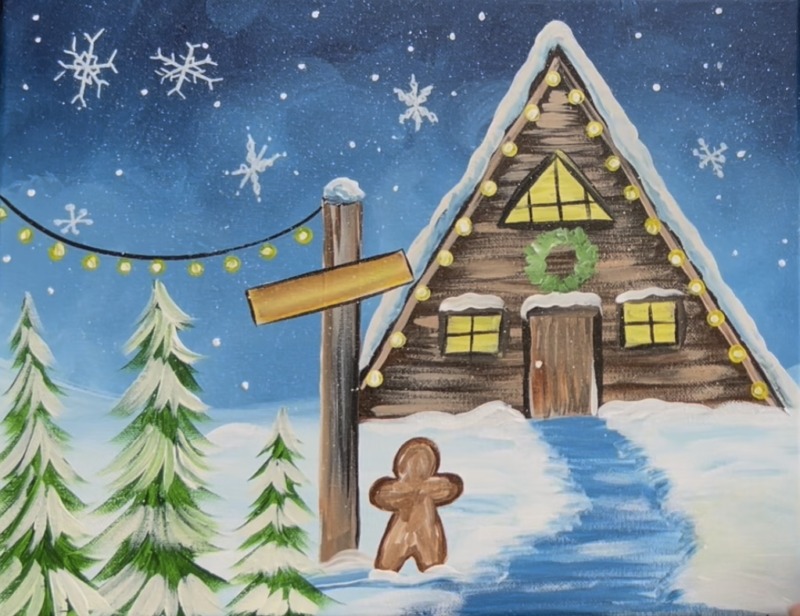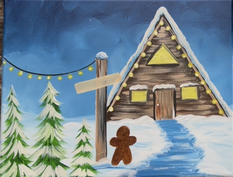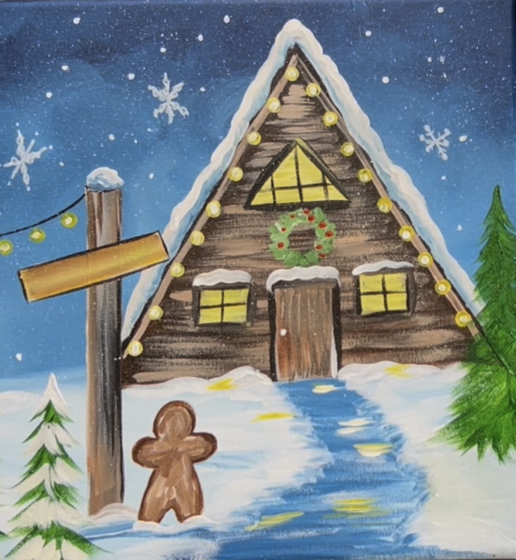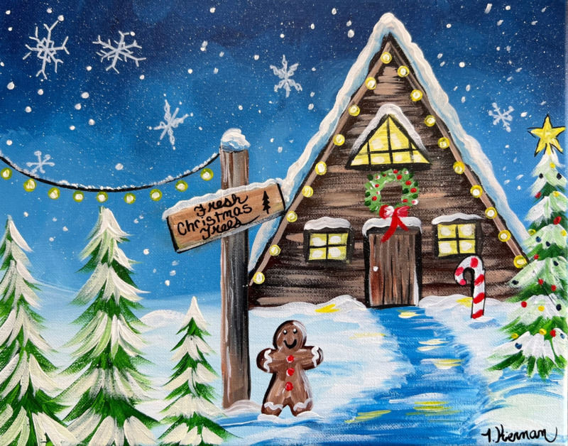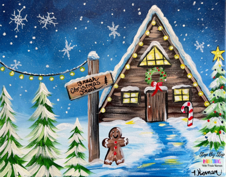 Capture the magic of the holidays with this charming A-frame cabin nestled in a snowy tree farm. There is an adorable gingerbread greeting you under glowing string lights. This painting is fun, festive, and perfect for beginners who want to create a cheerful winter landscape.