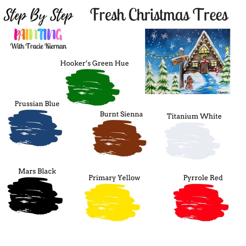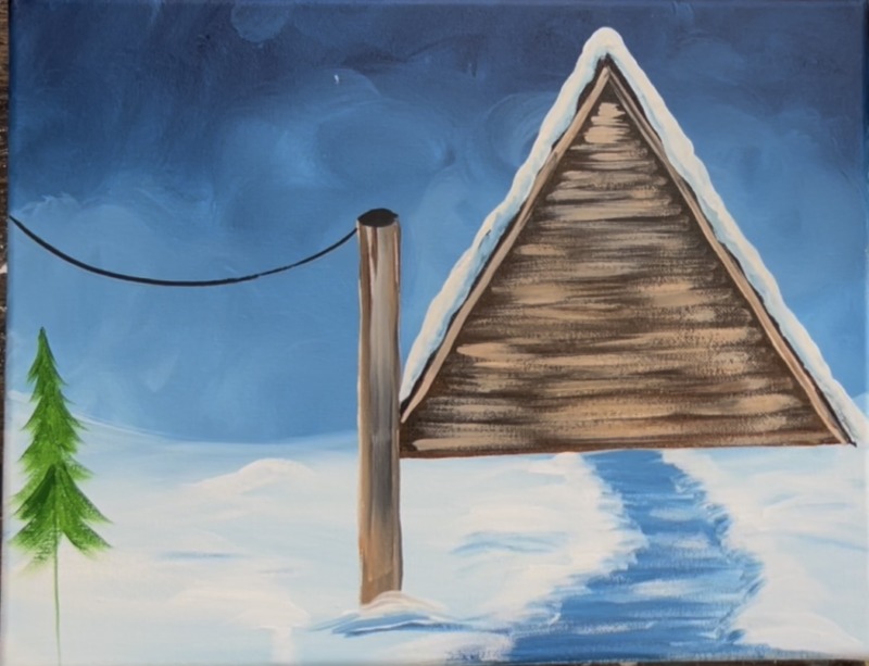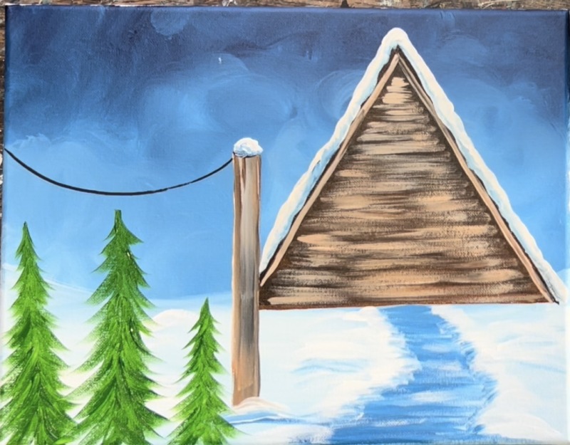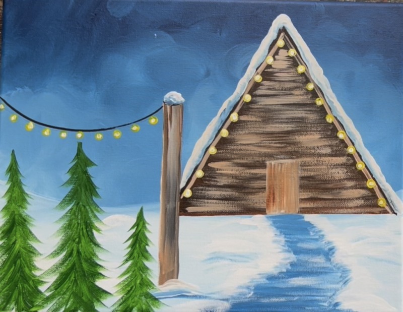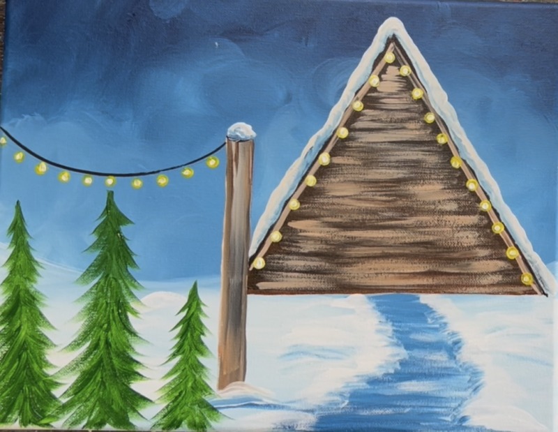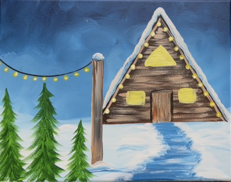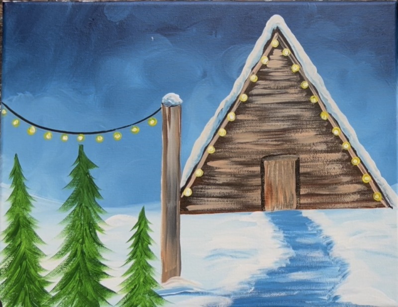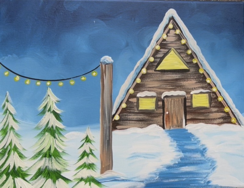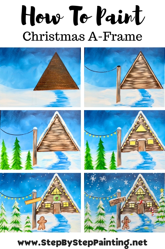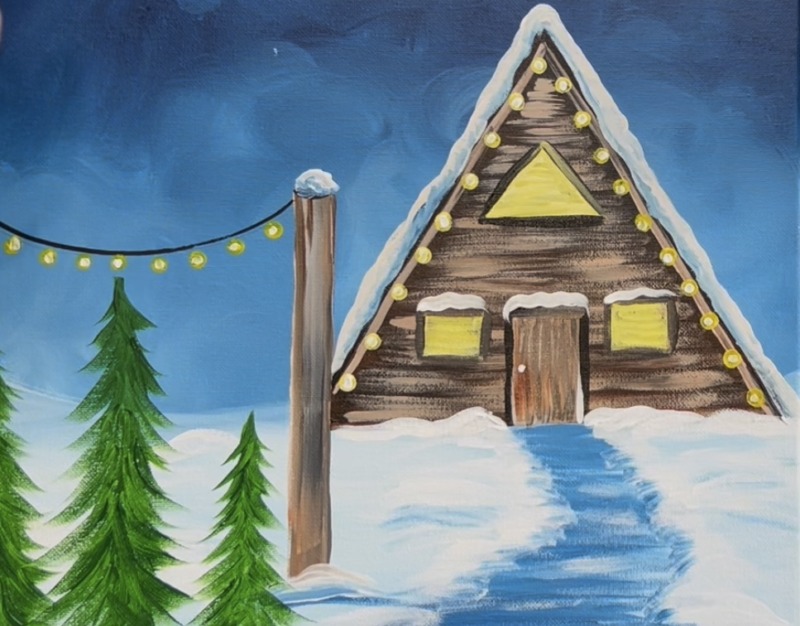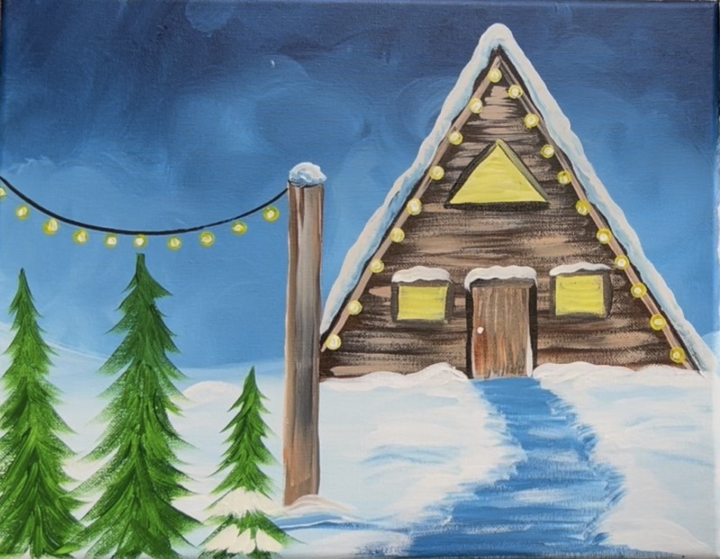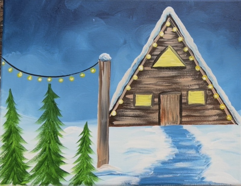 Capture the magic of the holidays with this charming A-frame cabin nestled in a snowy tree farm. There is an adorable gingerbread greeting you under glowing string lights. This painting is fun, festive, and perfect for beginners who want to create a cheerful winter landscape.