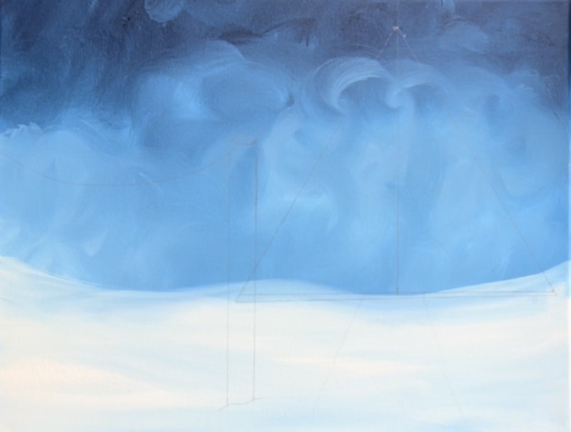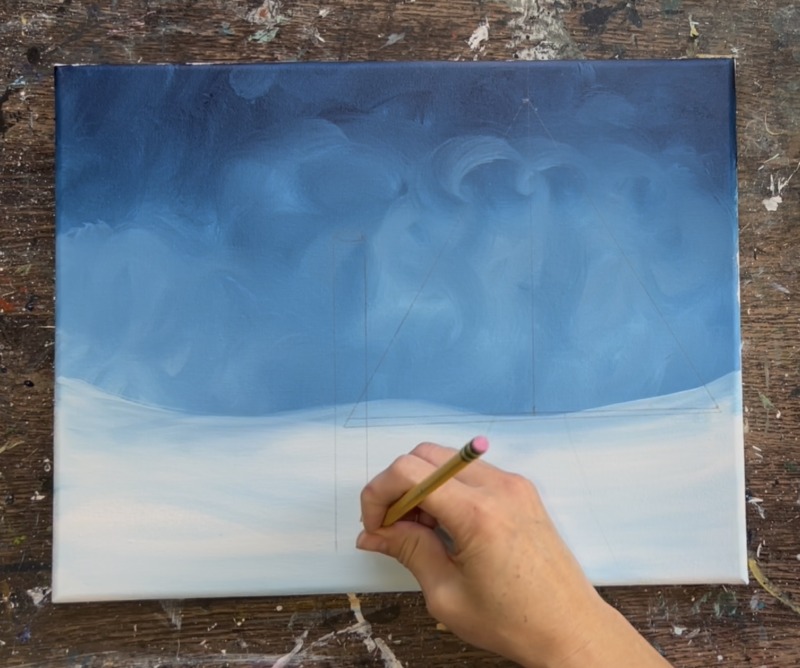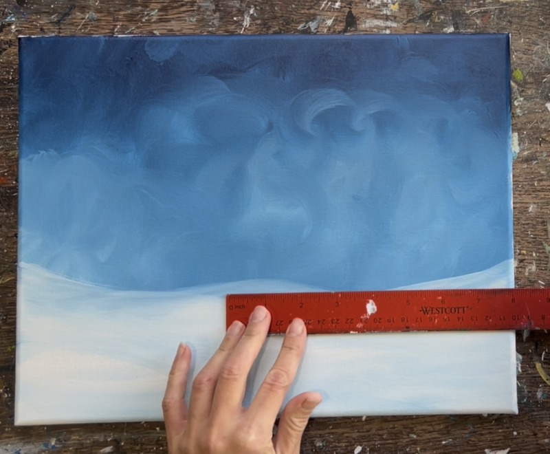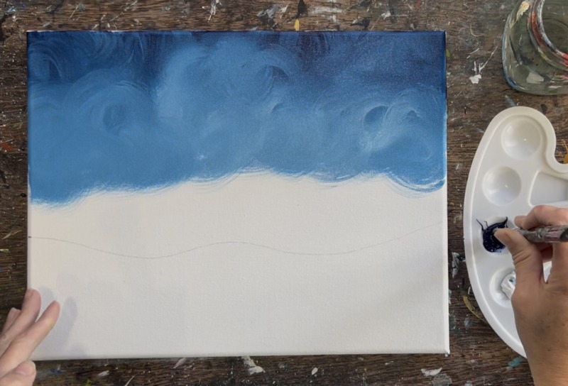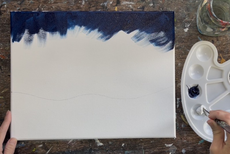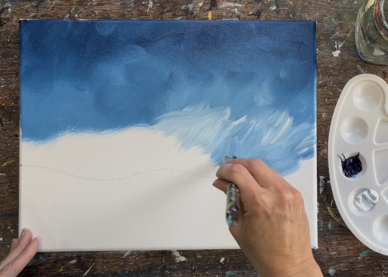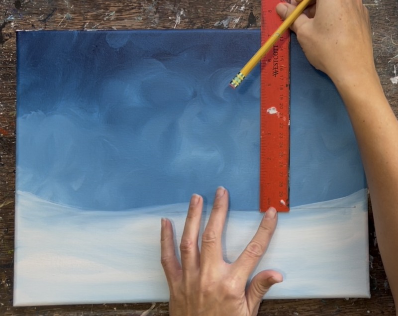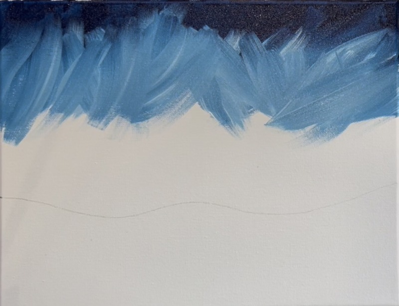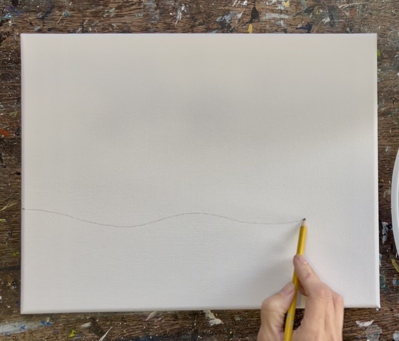 Measure 4″ from the left bottom edge of the canvas. Then draw a loose, wavy line with a pencil. This will be the “horizon line”.