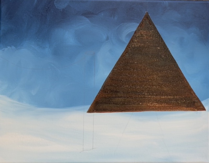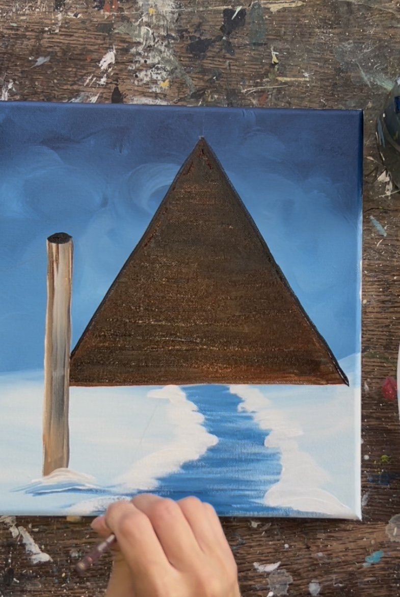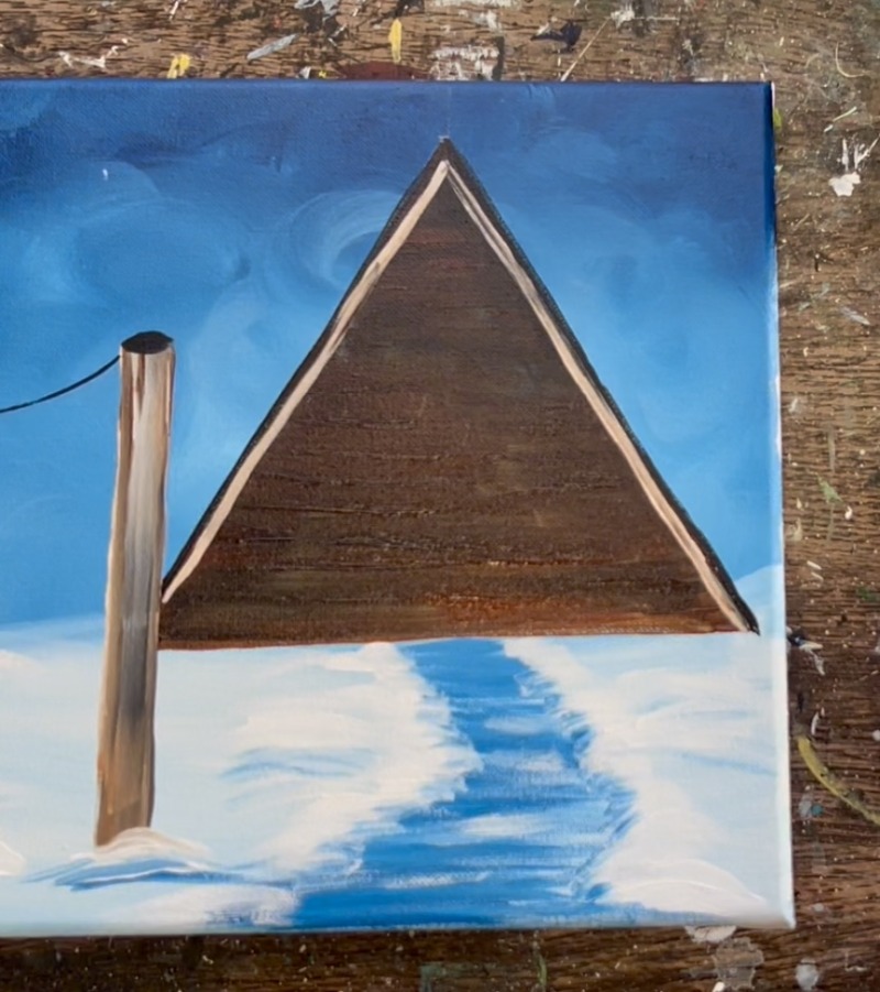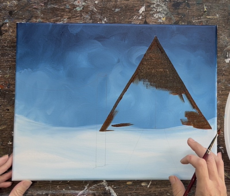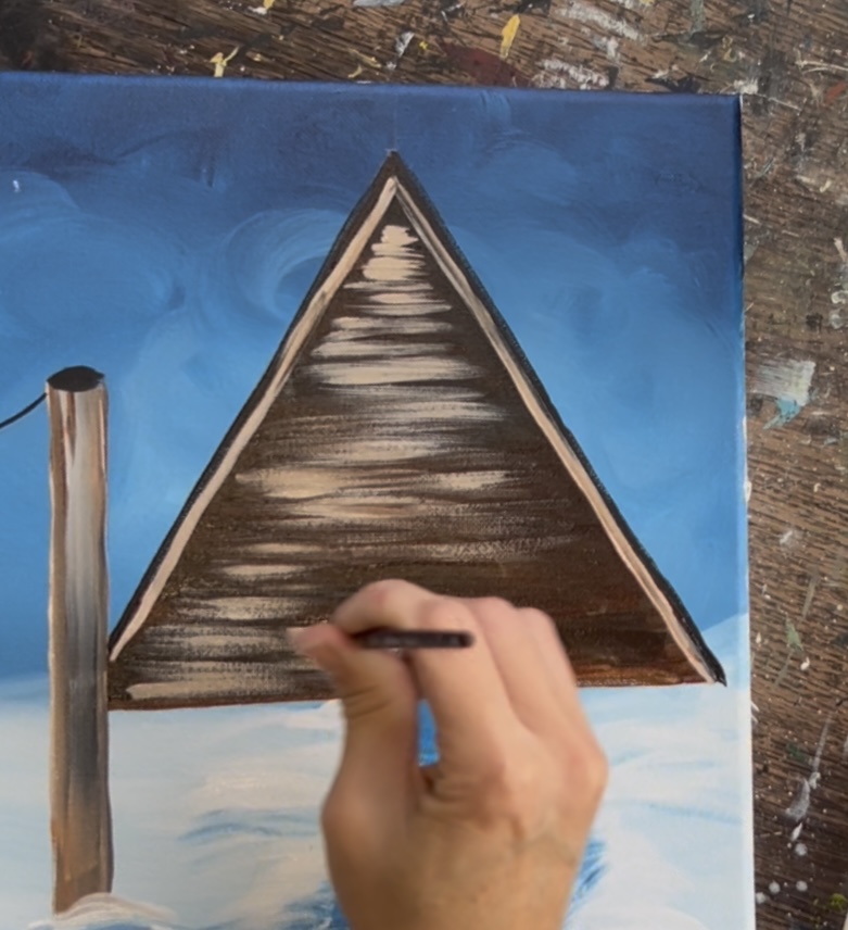 Blend little bits of black into the triangle for more “color variation” in the triangle. Make sure everything is left and right paint strokes going all the way across the triangle shape. This will help to create the “siding texture” in the cabin that we will do in a later step.