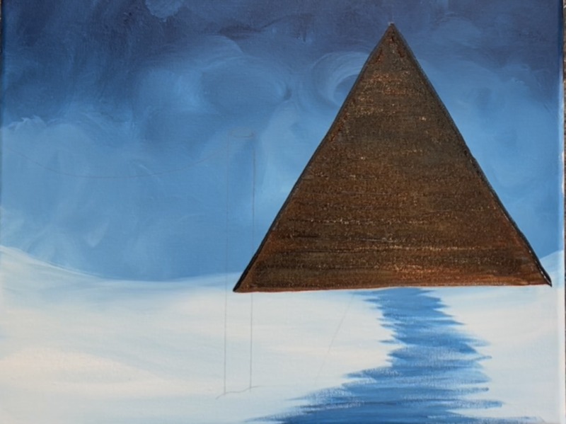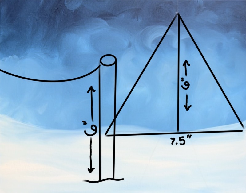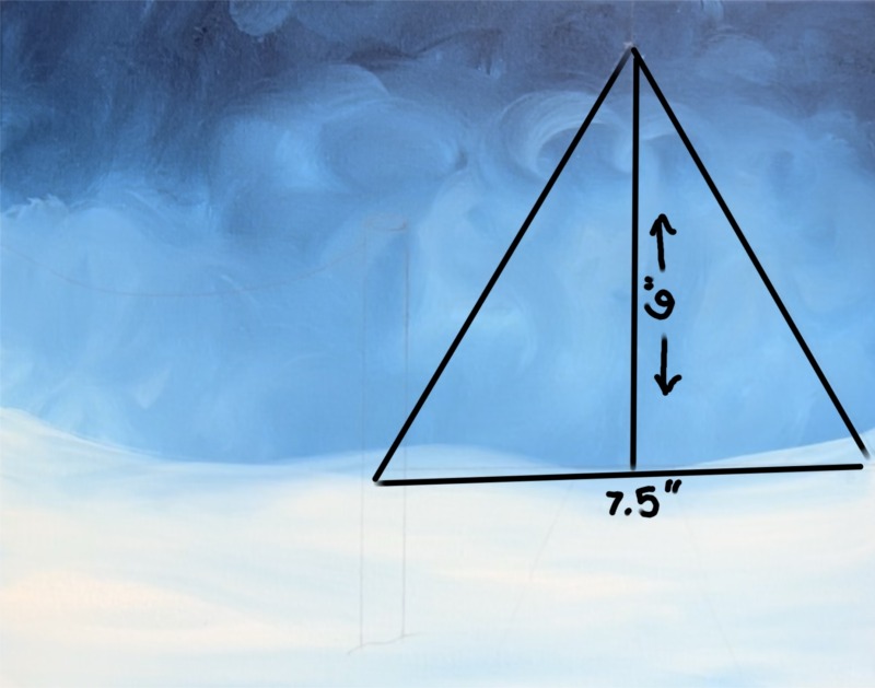 Measure 7.5″ for the horizontal line of the triangle and draw a line. This is positioned just slightly below the “horizon line” and just slightly offset to the left.