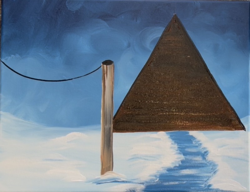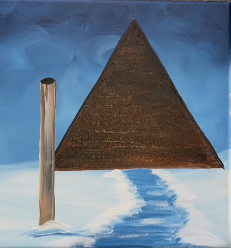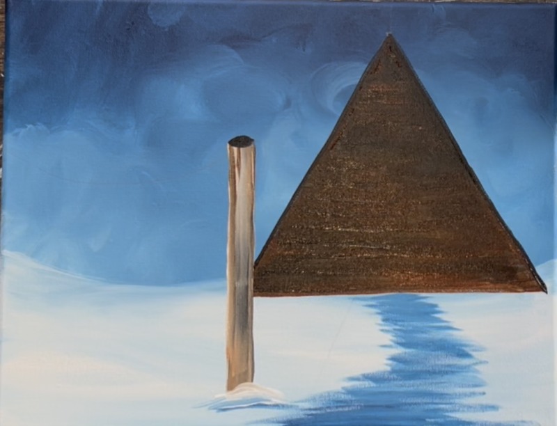 Use the #4 round brush and “mars black” to paint the oval on the top of the pole. Then paint a little pile of white snow that overlaps the bottom of the pole.