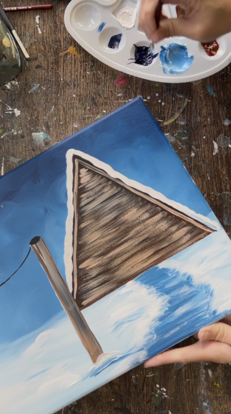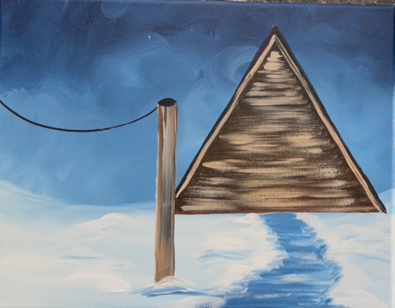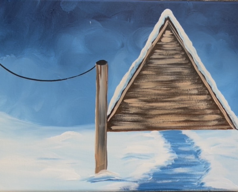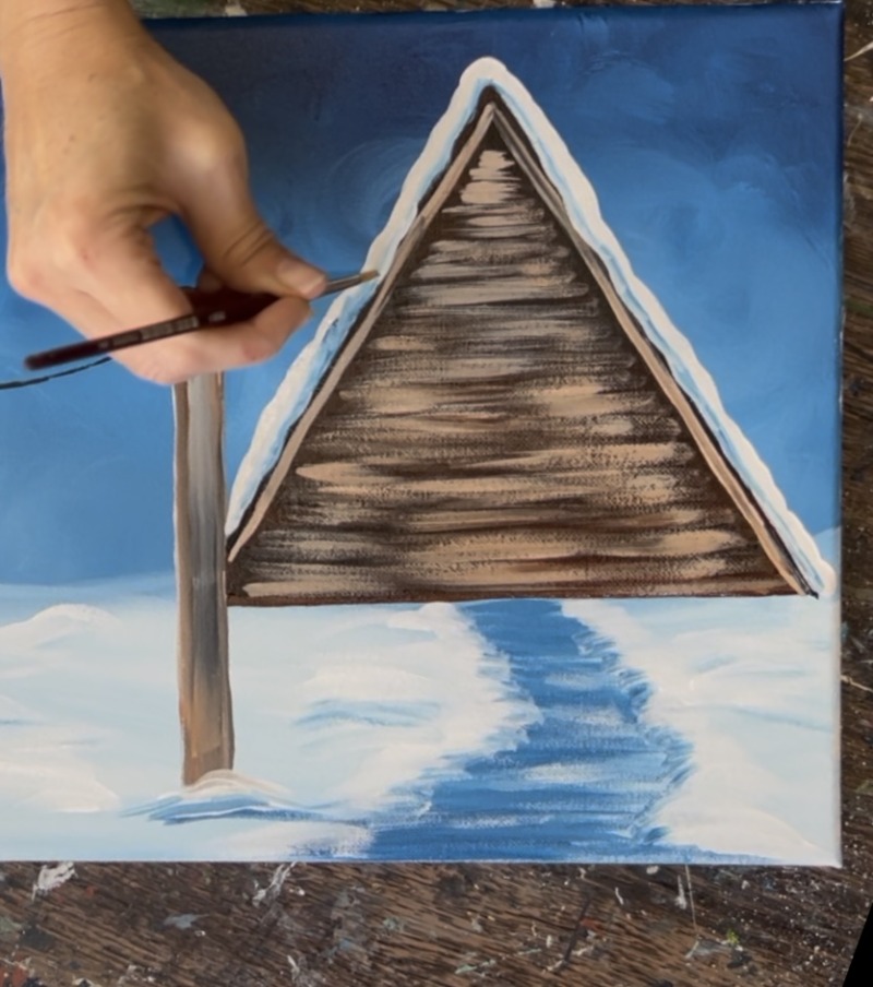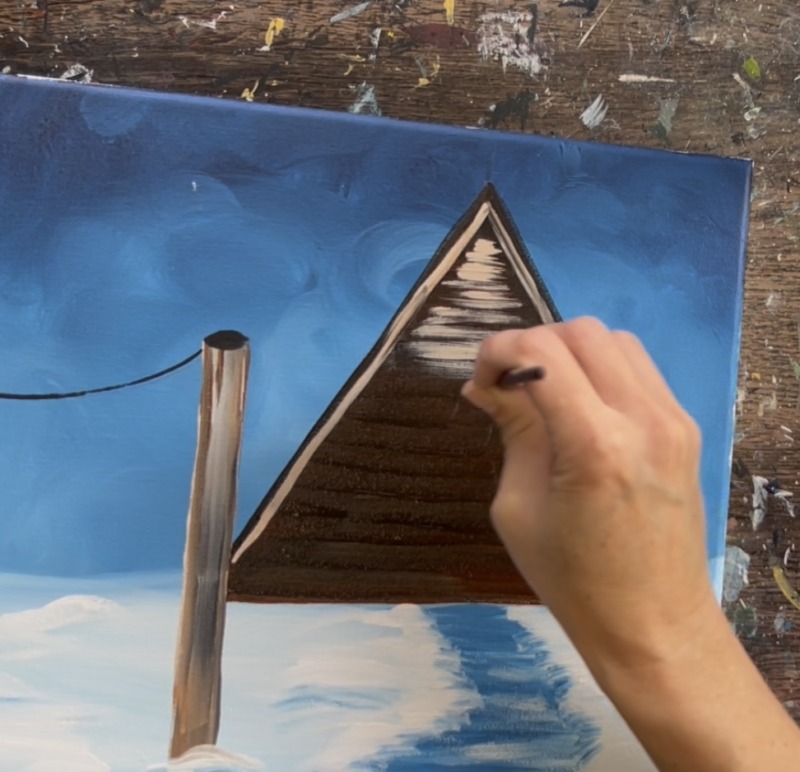 Use the #4 round brush and “titanium white”. Apply snow to the top edges of the a-frame roof.