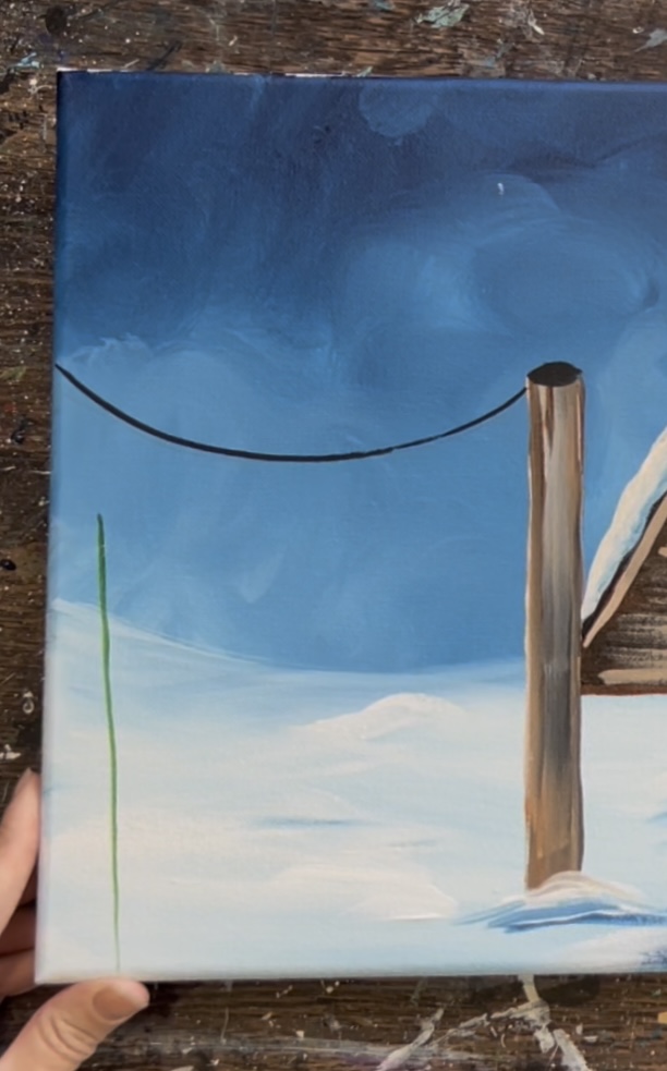 Use the #4 round brush and “titanium white” to paint little snow dots throughout the sky. You can even use a toothbrush (or a flat brush) to flick specks of snow all over the painting!
