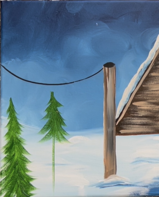 Use the #8 round brush to paint another Christmas tree on the right side of the painting. I made this one go off the right edge of the canvas and only slightly overlap the cabin.