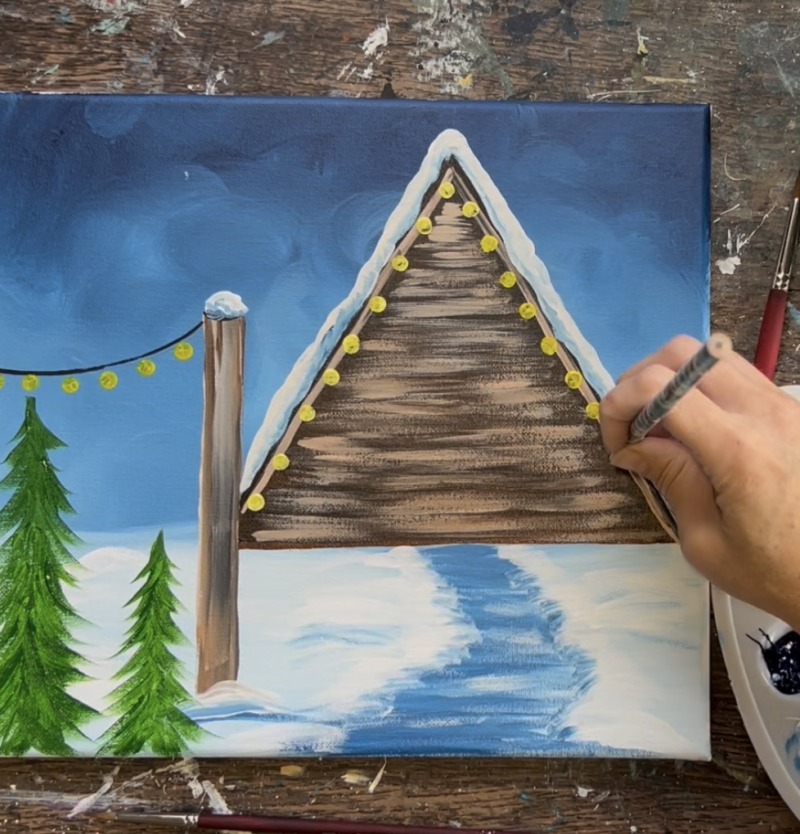 Repeat this for the lights on the cabin. This time, mix yellow and white together and load the eraser into the bright yellow color. Paint the lights a “finger width” apart along the edge of the roofline.