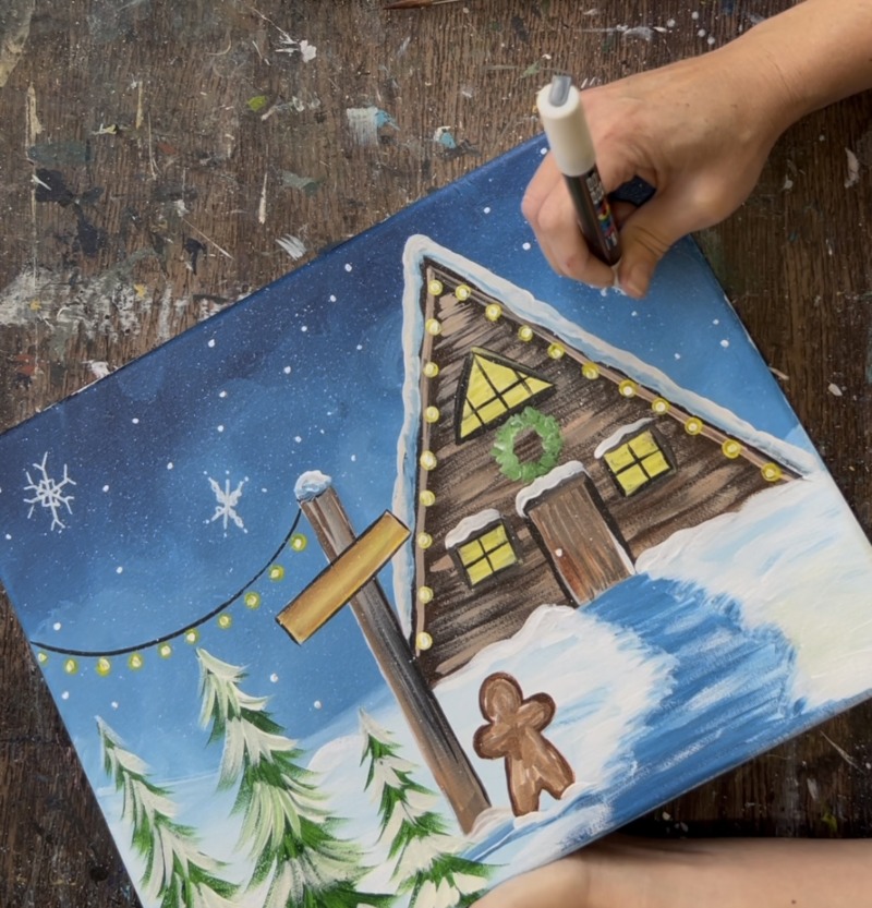 You can also use the black paint pen to outline details in the painting such as the candy cane, start on the tree, the sign, etc. Another final detail you can do is add snow on the sign and little dots of snow on the string lights.