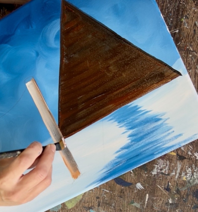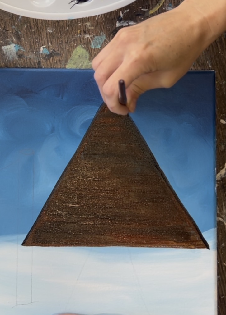Use the 3/8″ angle brush for this step (or any flat brush). Mix 2 parts “burnt Sienna” and 1 part “mars black” to make a very dark brown. Use the brush to outline the inner part of the triangle. Then paint all left and right paint strokes to fill the triangle in.