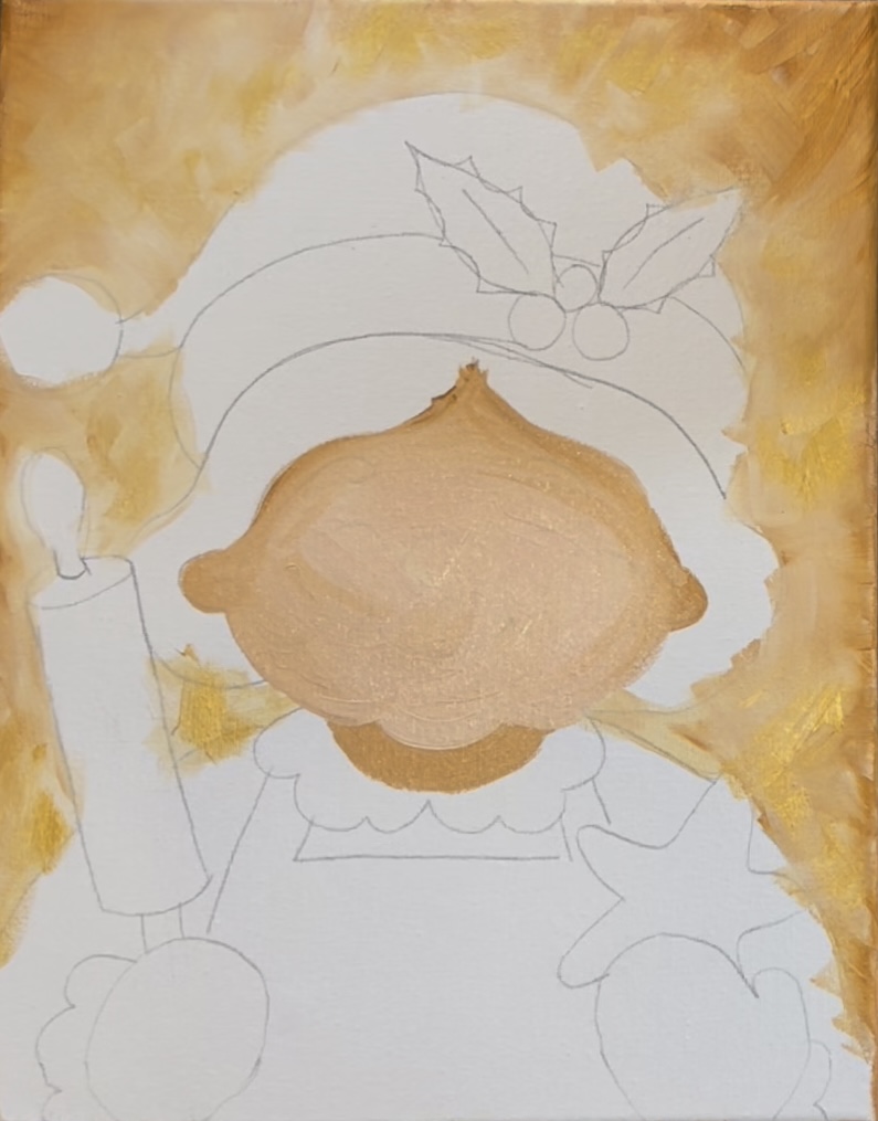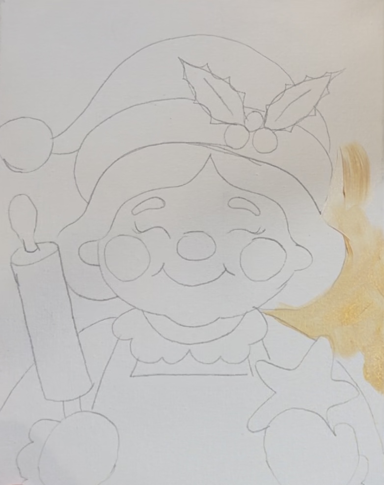Lightly outlining helps to create contrast in this style of painting and also helps to define shapes. I lightly outlined the edge of the star cookie with mars black. I also did “loose outlining” on the bottom of the hat, around the mittens, the edges of the apron, bottom of the collar and around the ball of the hat. When you “loosely outline”, you don’t outline the entire line. It’s more of a broken, very thin line that is not continuous.