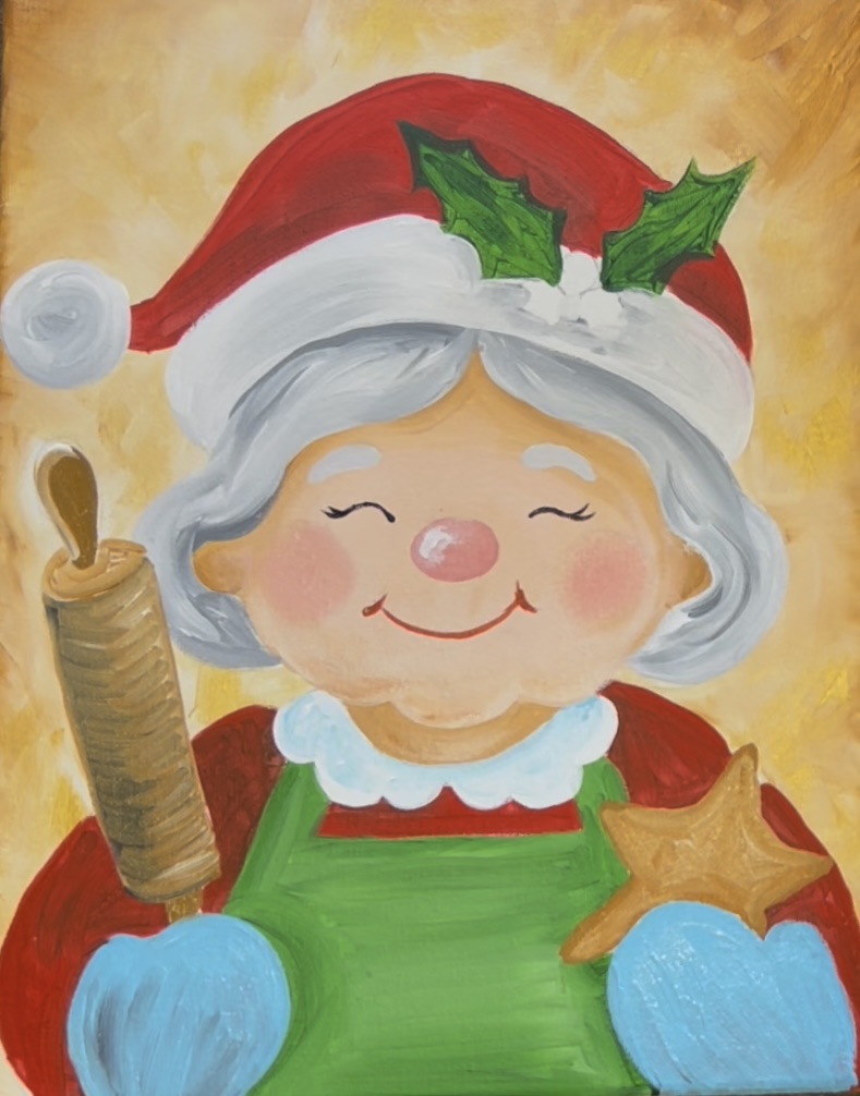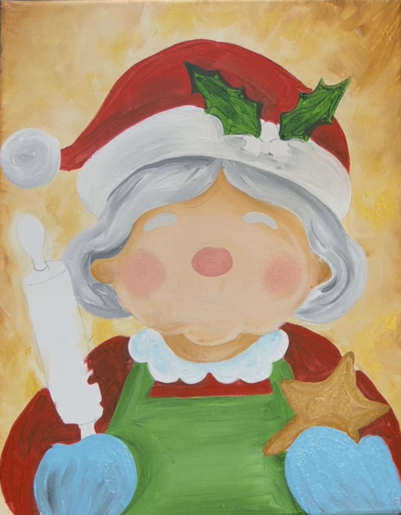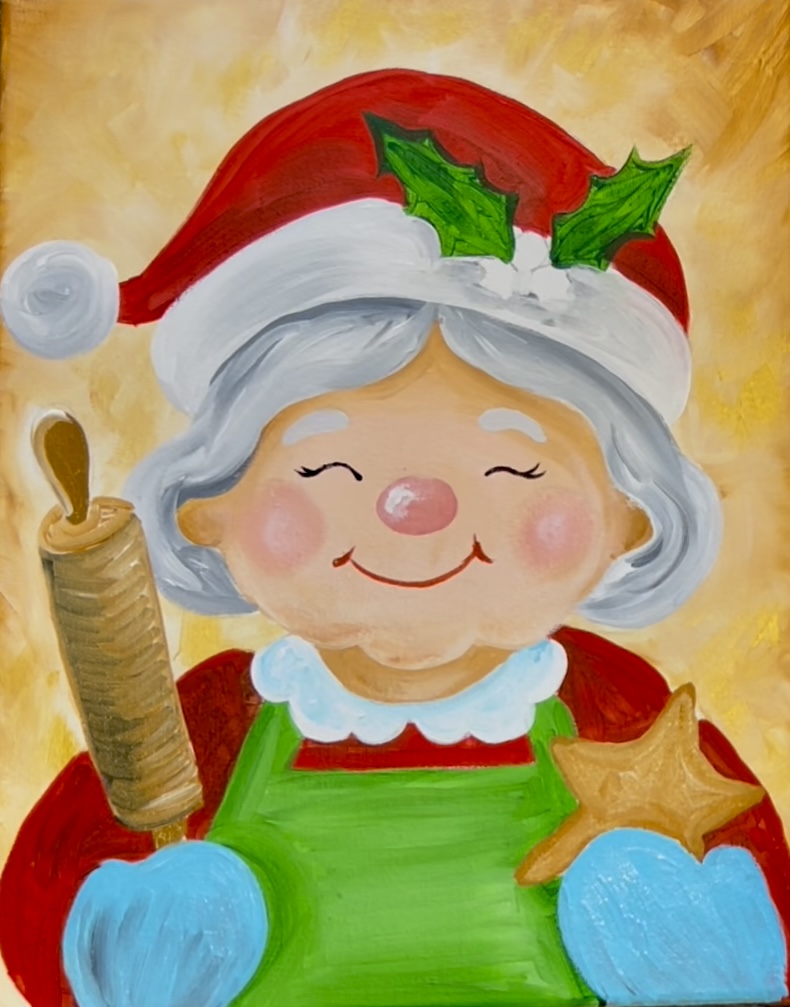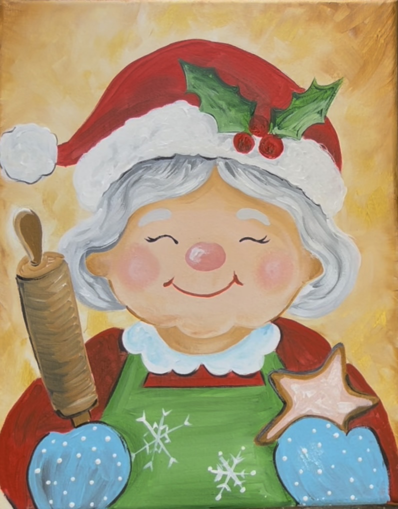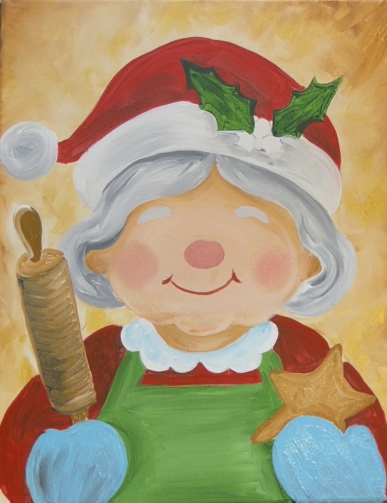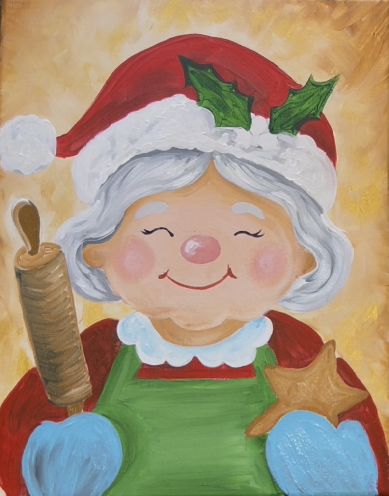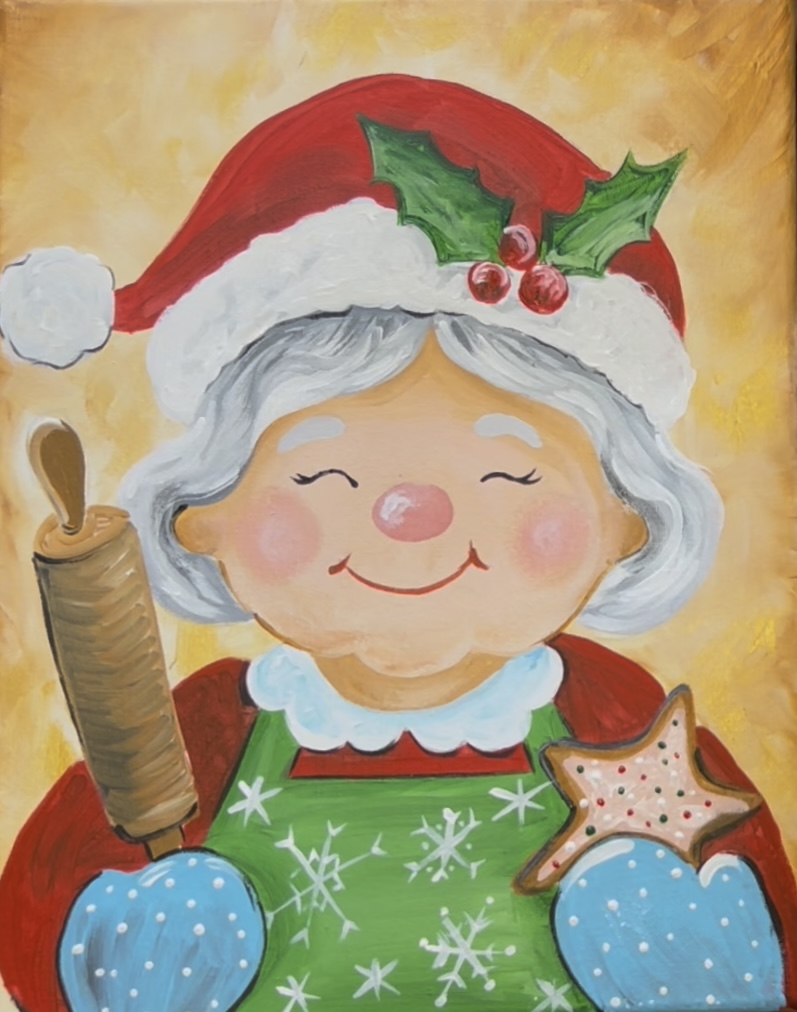 In this cheerful holiday painting, we’ll create a cute, whimsical Mrs. Claus holding a rolling pin in one hand and a freshly baked star-shaped cookie in the other. The background is a soft, glowing blend of warm golden tones that gives the whole piece a cozy Christmas feel.
