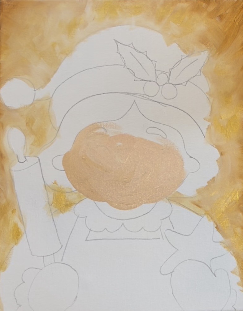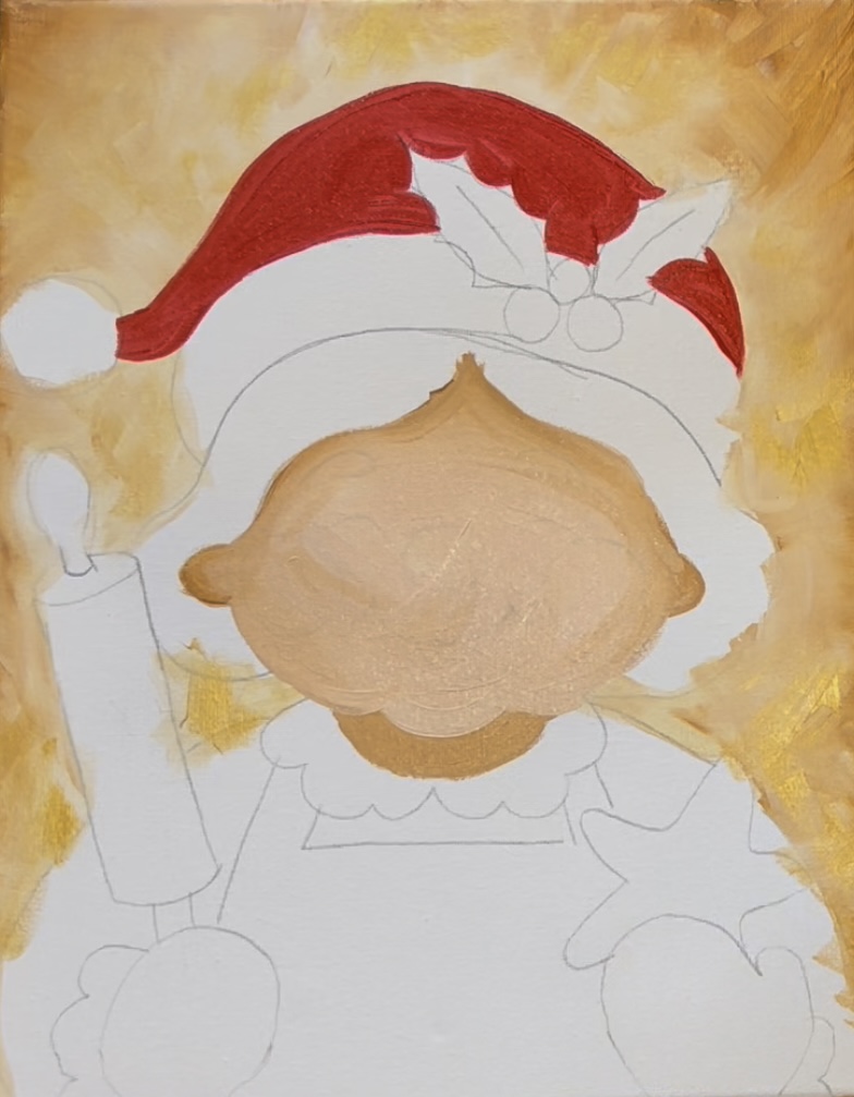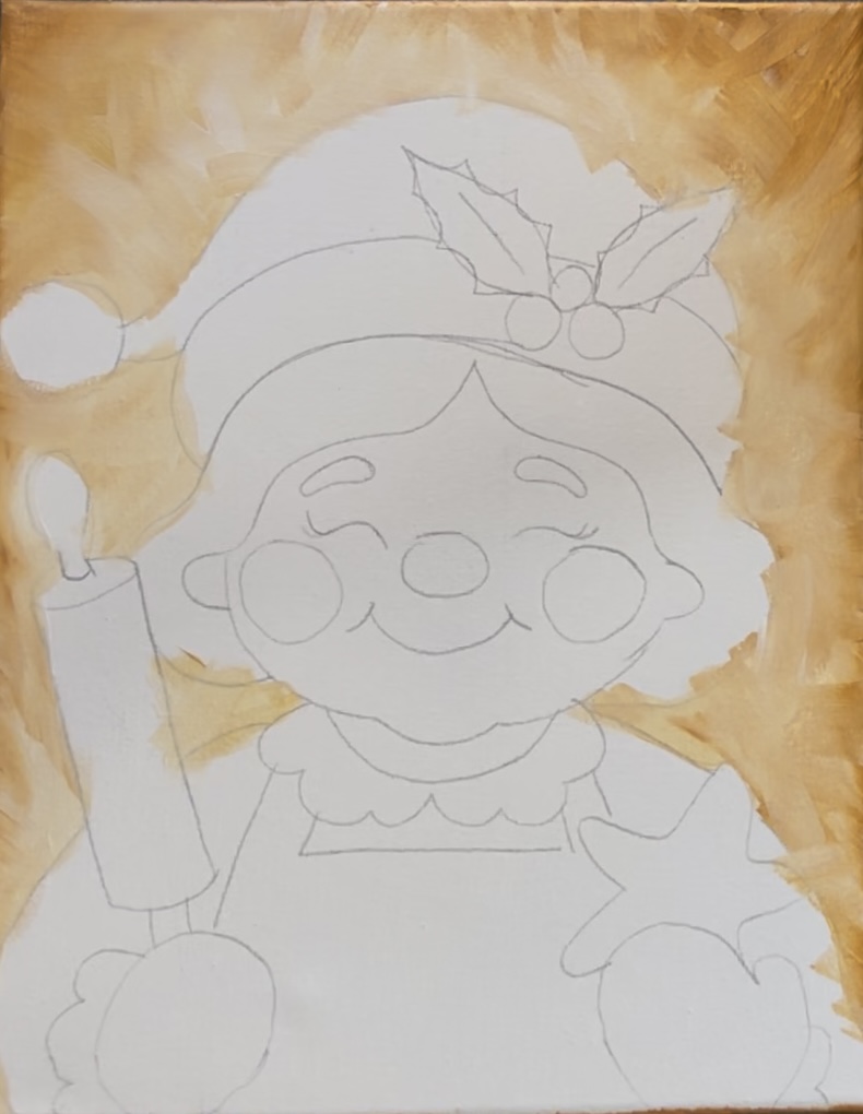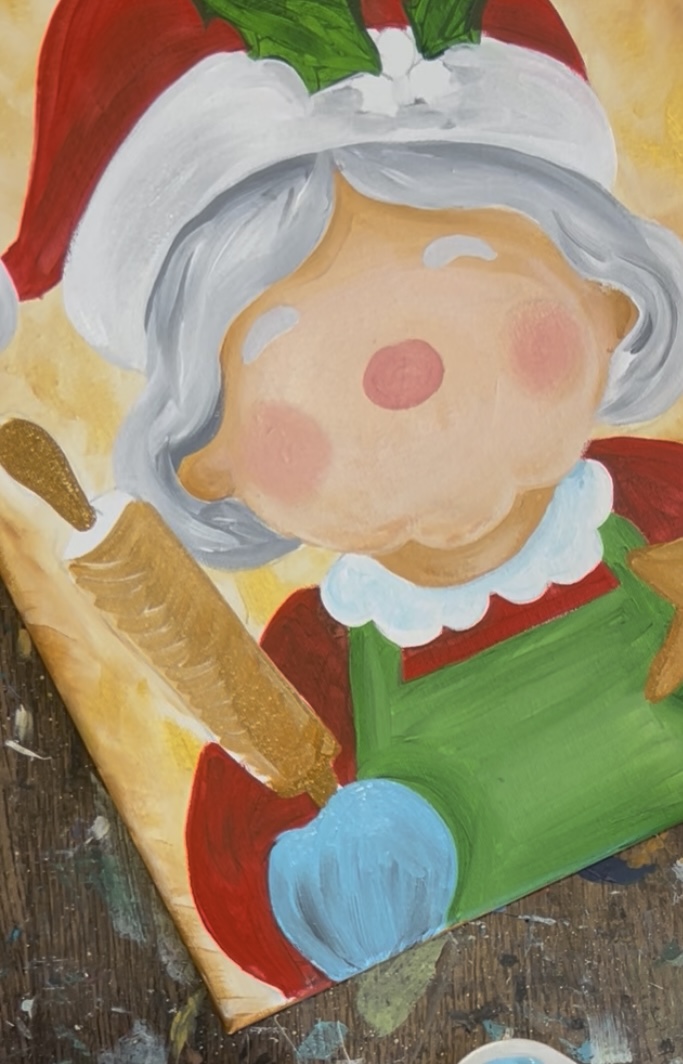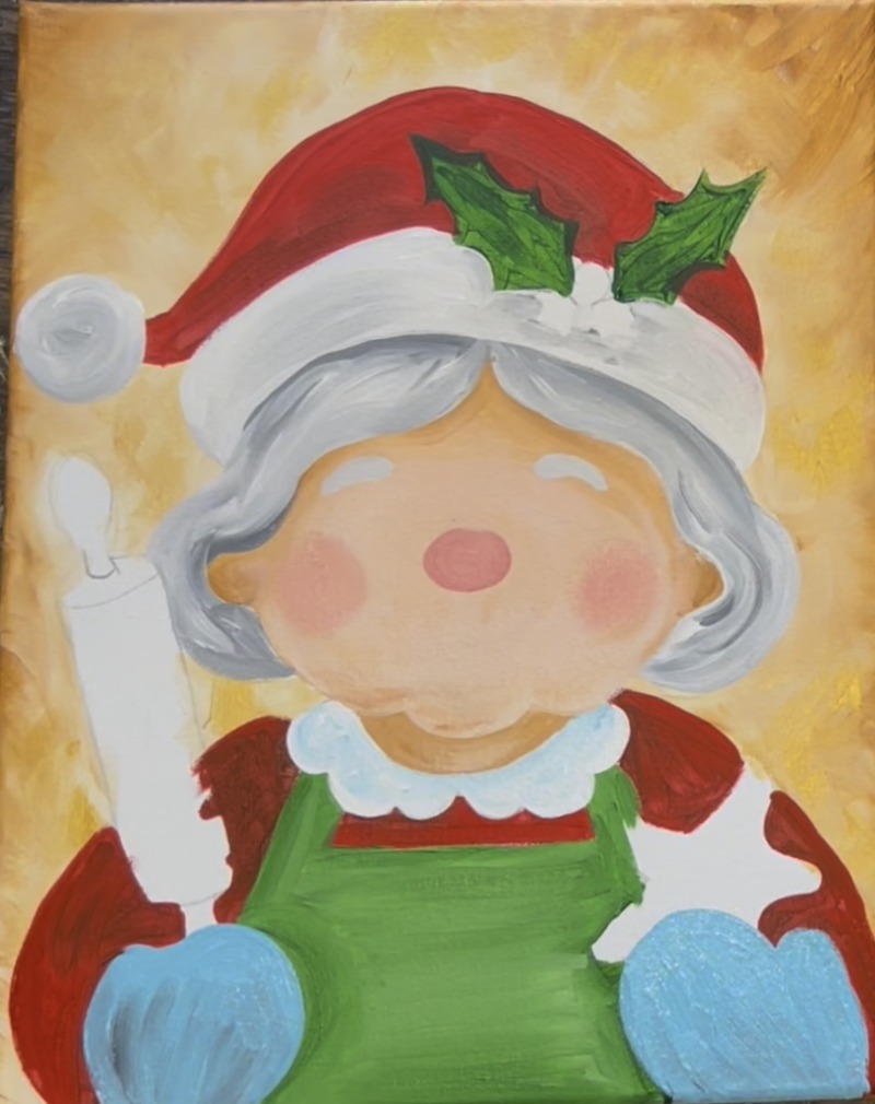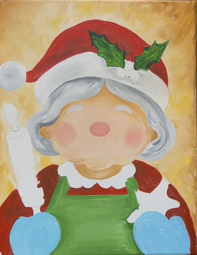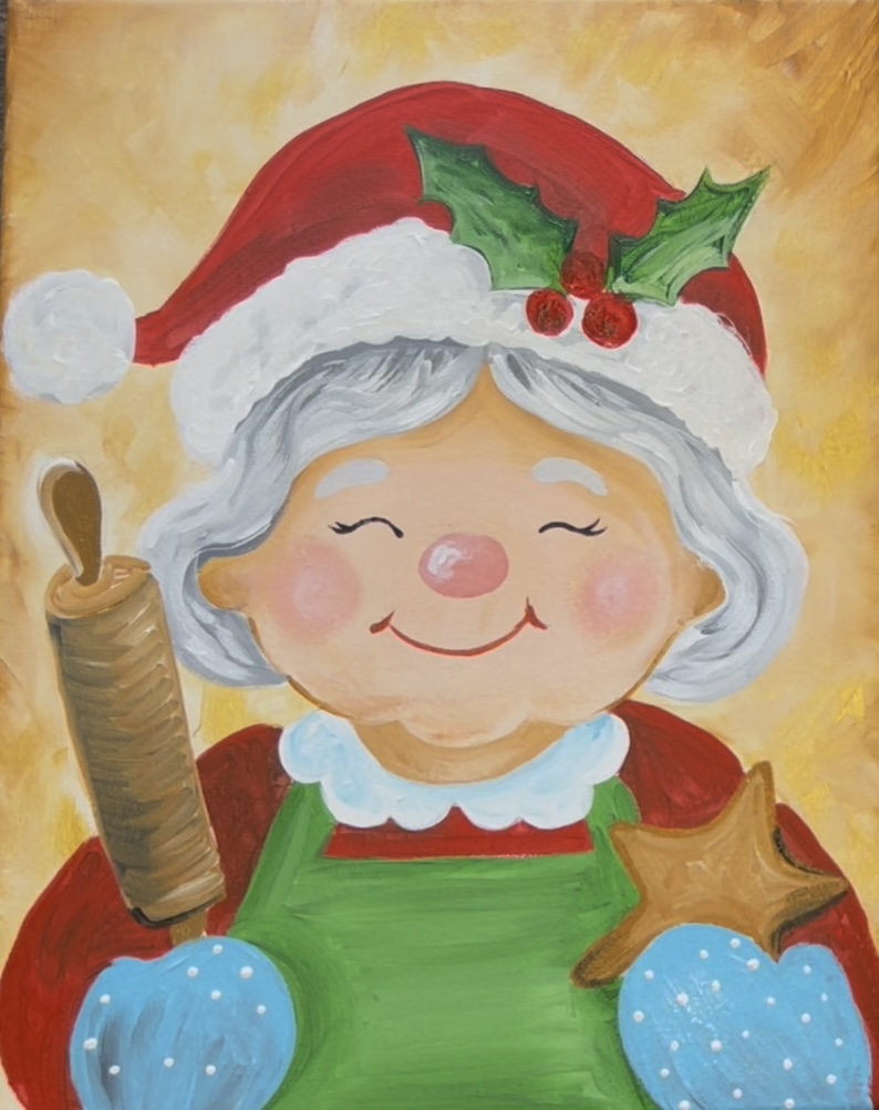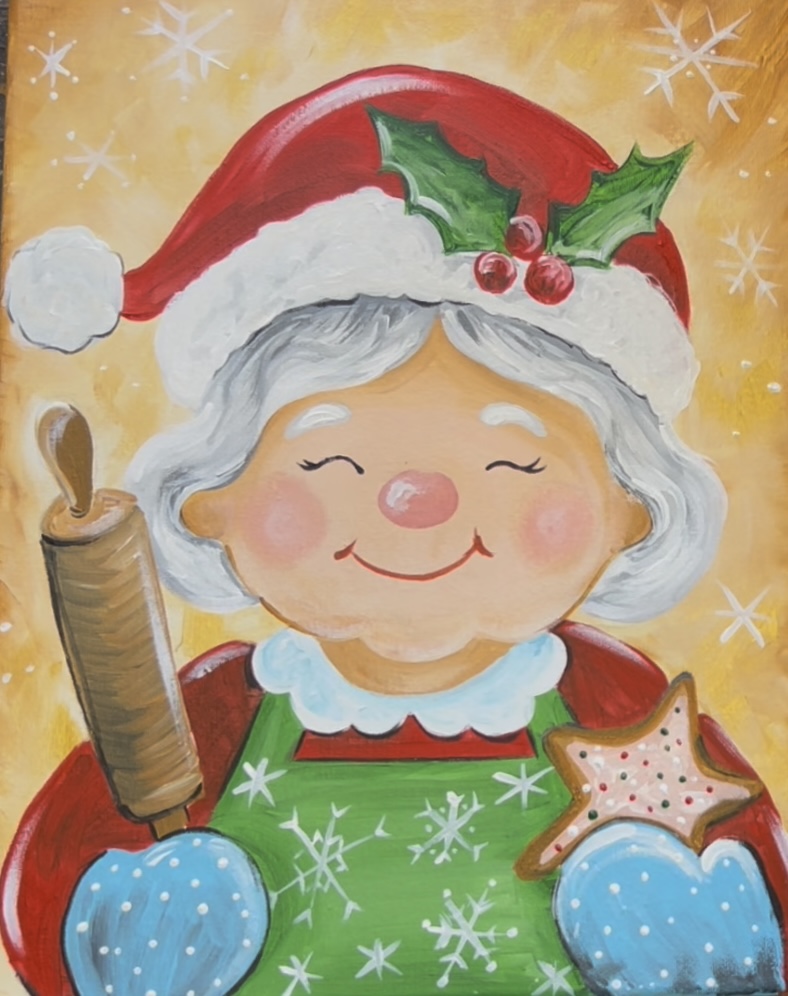 In this cheerful holiday painting, we’ll create a cute, whimsical Mrs. Claus holding a rolling pin in one hand and a freshly baked star-shaped cookie in the other. The background is a soft, glowing blend of warm golden tones that gives the whole piece a cozy Christmas feel.