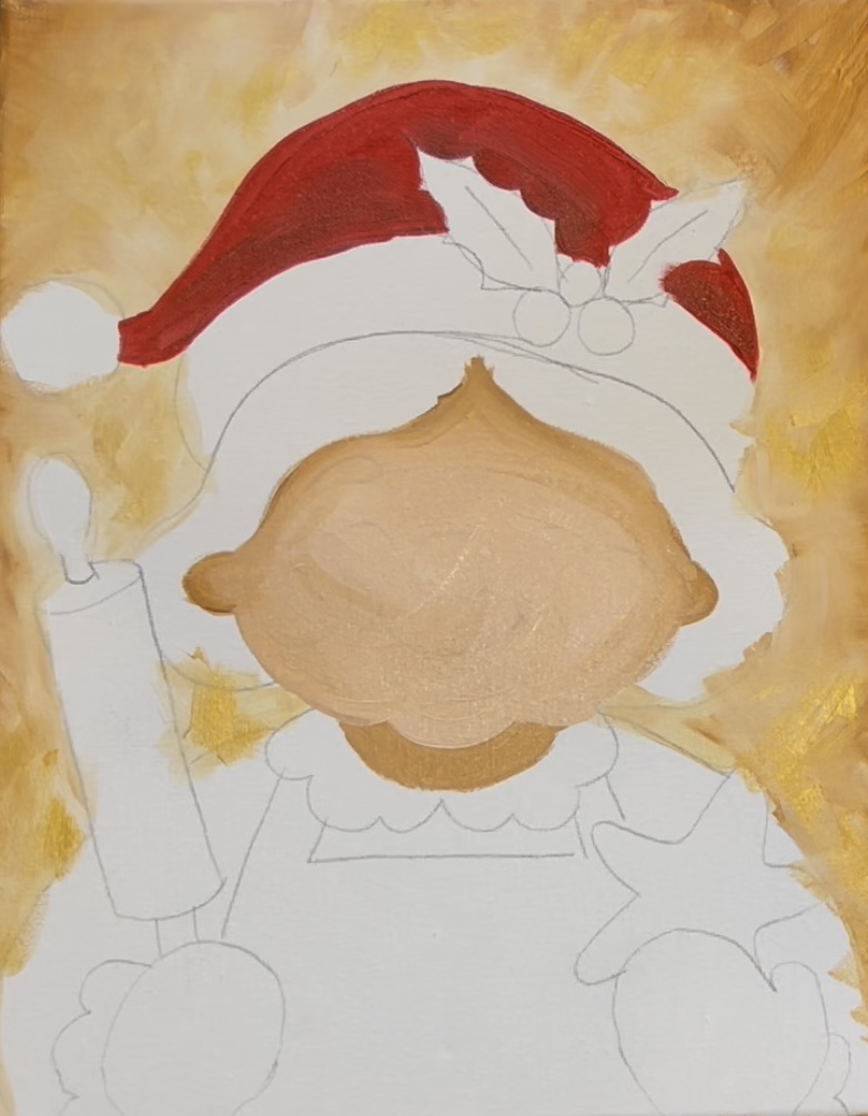 Paint Mrs. Claus’s shirt. Use the same “dark red” color for shadowing in the areas around the rolling pin and cookie.
