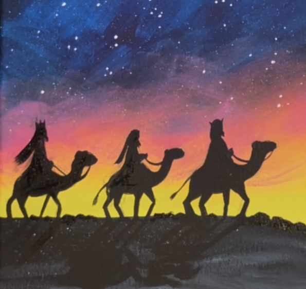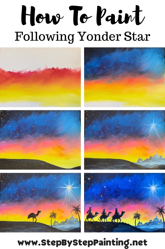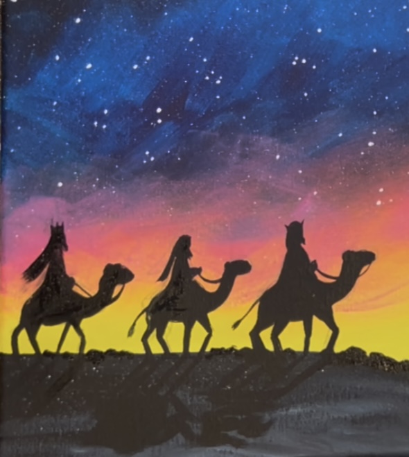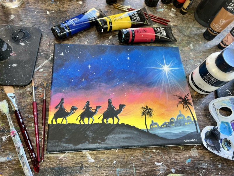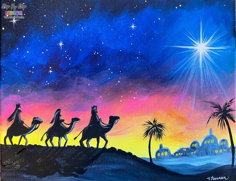 Create your own stunning Christmas canvas with this beginner acrylic painting tutorial featuring the Three Wise Men traveling under the bright Star of Bethlehem. This step-by-step lesson walks you through blending a vibrant sunset sky, adding simple silhouettes, and painting a vibrant Christmas star.