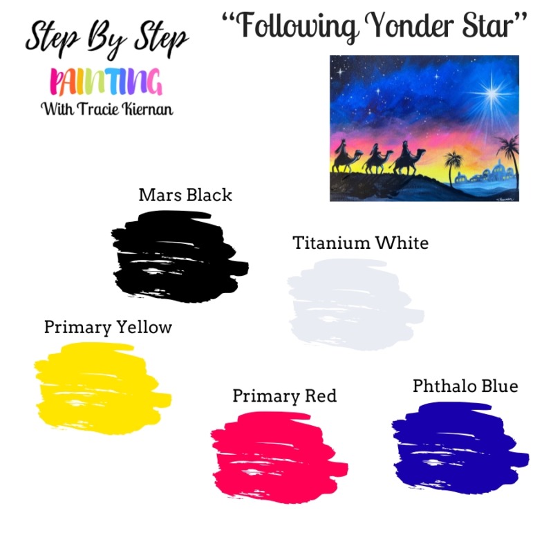 Load your paint palette with the colors: titanium white, primary yellow, primary red, phthalo blue and mars black. These are all the colors we will be using in the sky! The sky will be started on the bottom of the canvas with the brightest and lightest colors and we will blend up to our darkest colors!
