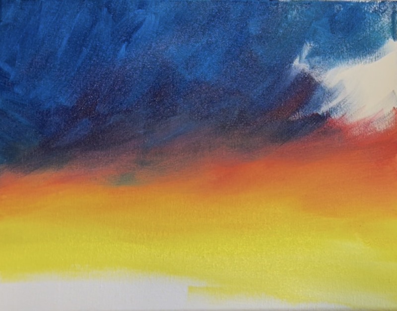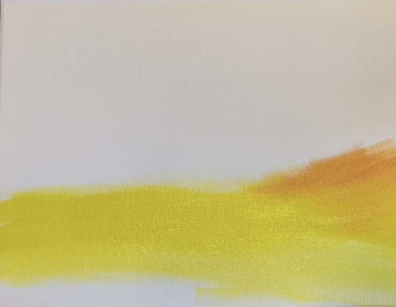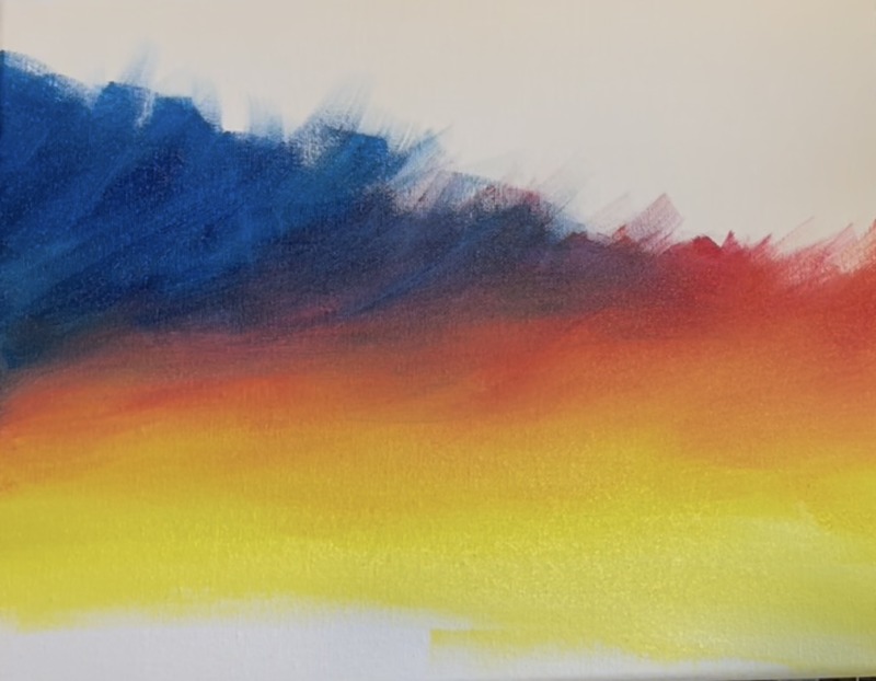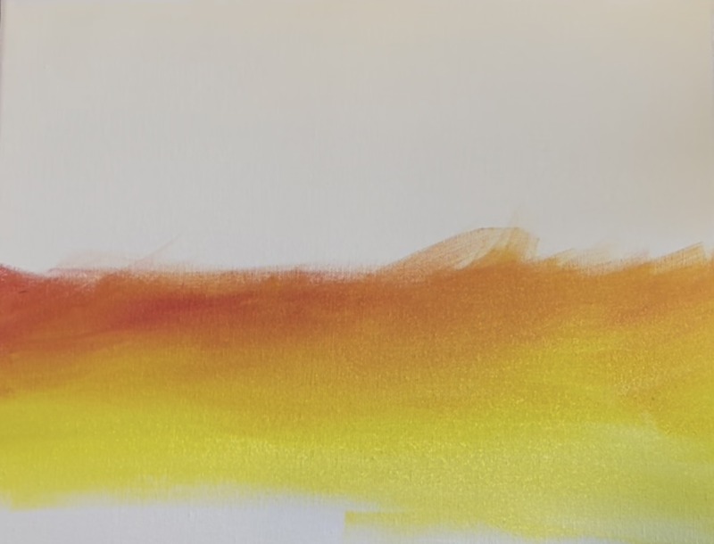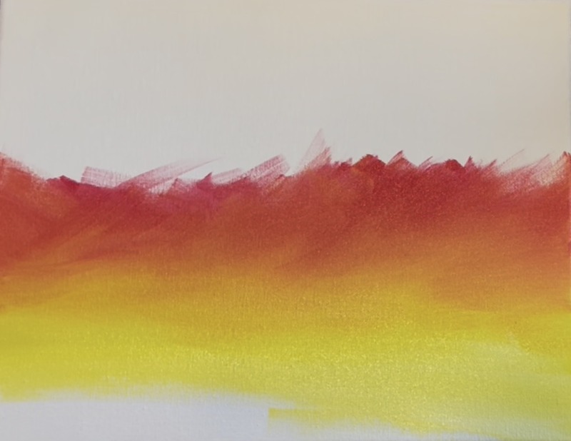 Create an orange area above your yellow across the canvas. Continue to blend tiny bits of the red into the yellow by painting choppy, angle paint strokes.