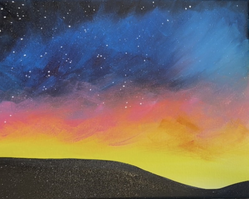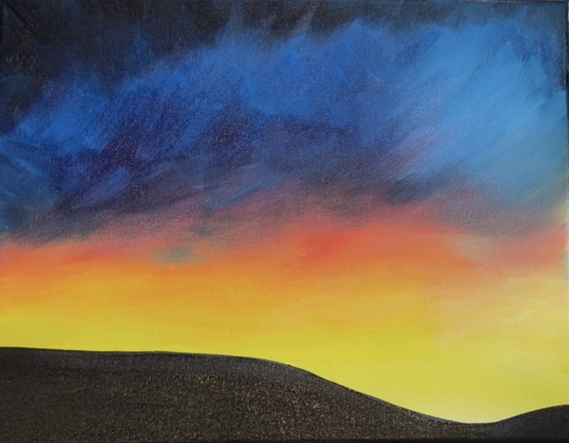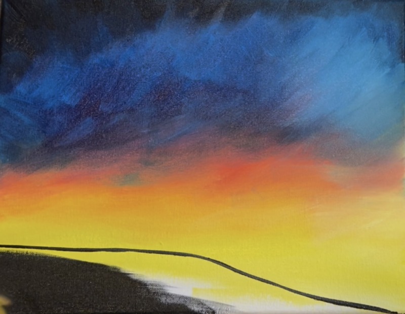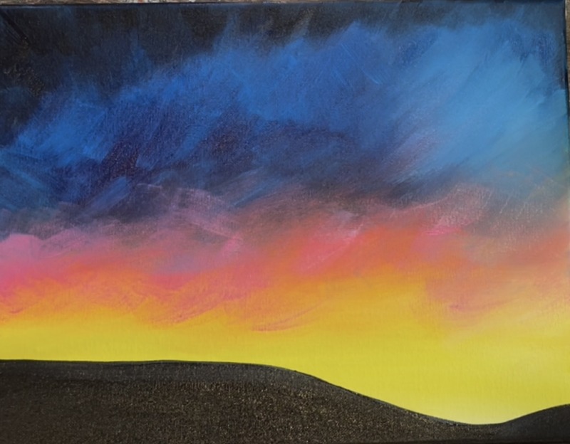 This is optional! I wanted to have more pink in the sky so I went back over the part where the blue transitions to the red. I mixed “primary red” with “titanium white” to make more of a pink color. Then I painted choppy/ angle paint strokes in that area. To blend with the rest of the sky, I used a dry brush to let it sort of fade away over the yellow and some of the dark blue.