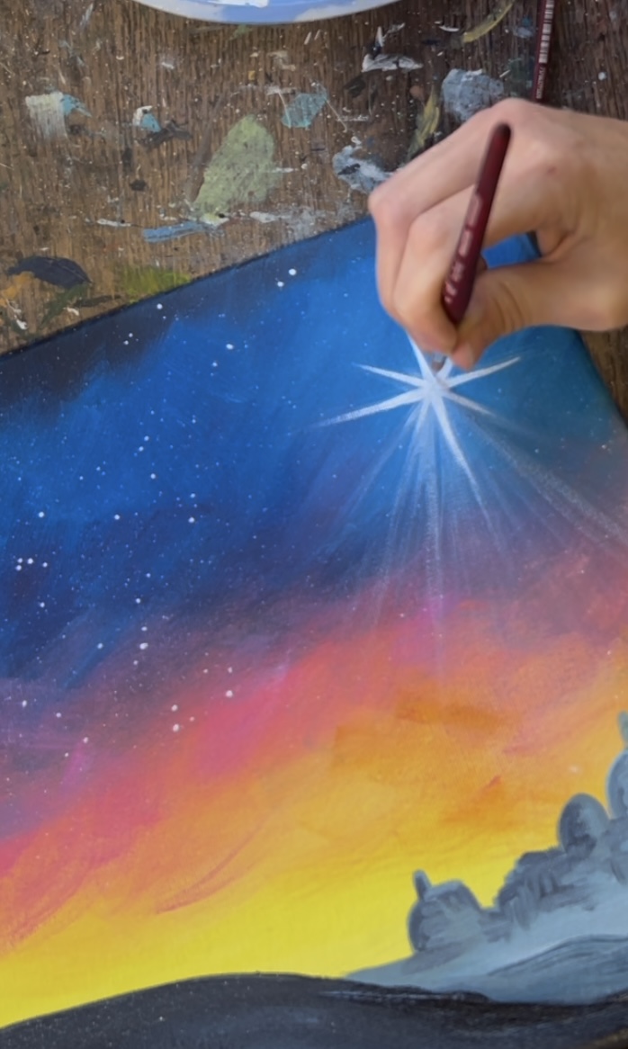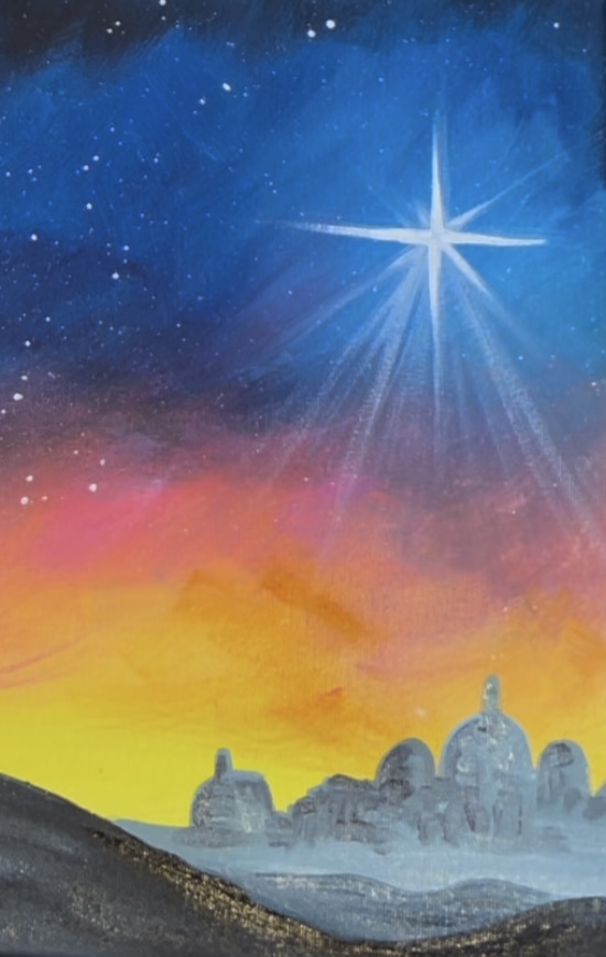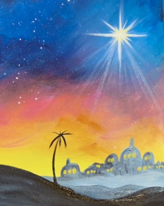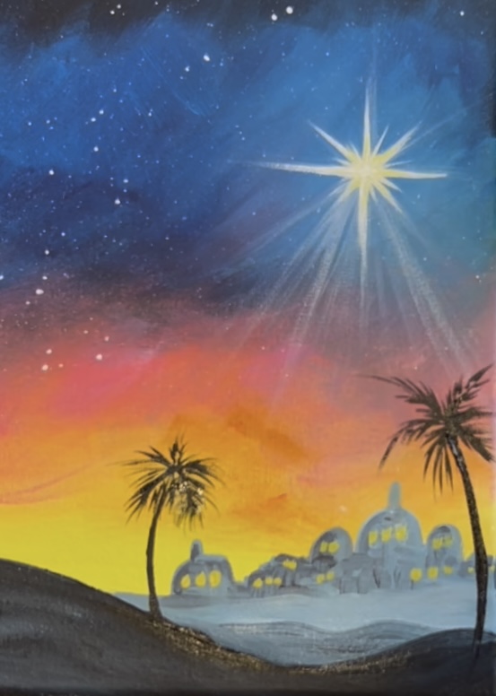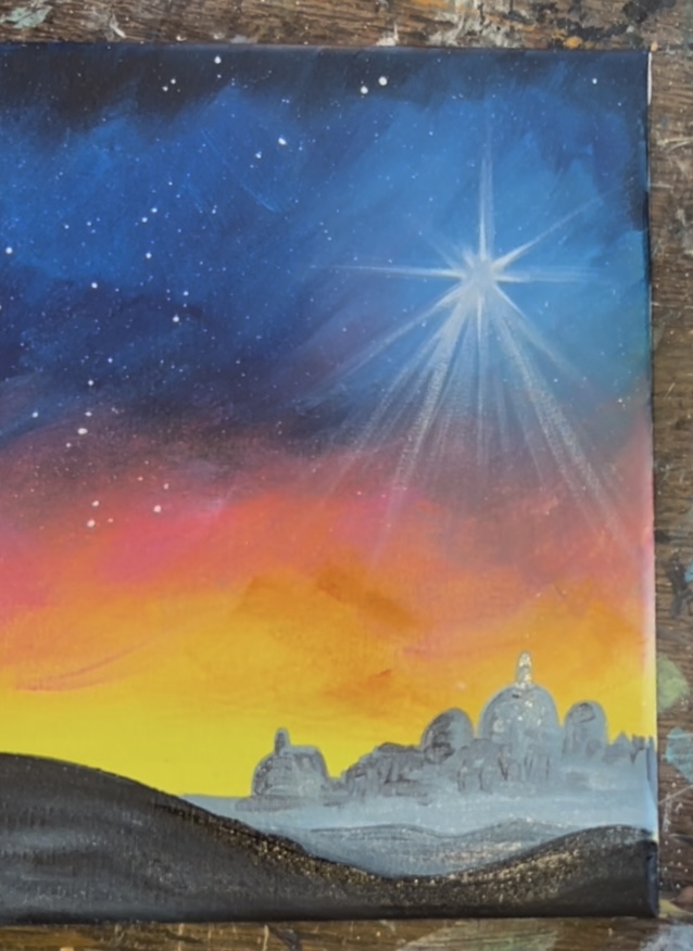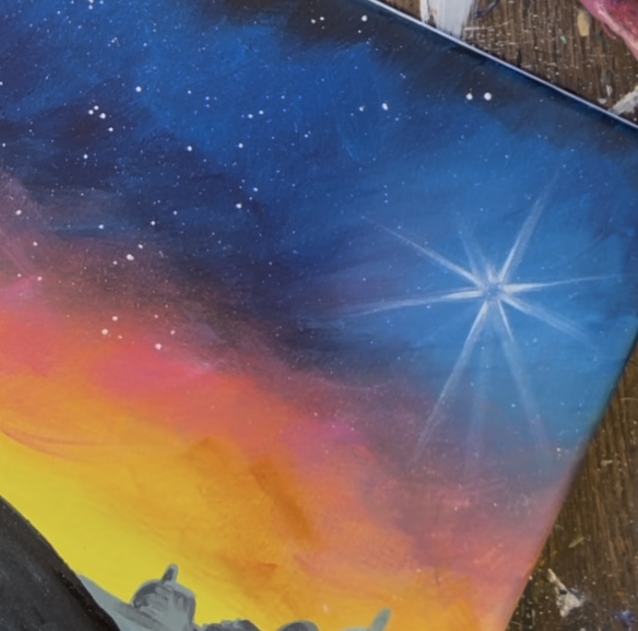 Some final touches for this painting can be: adding smaller pointed stars throughout the sky, adding thin white outlining on the town of Bethlehem (just along the edges of the shape) for an added “glow” and another bright white layer on the Christmas star.