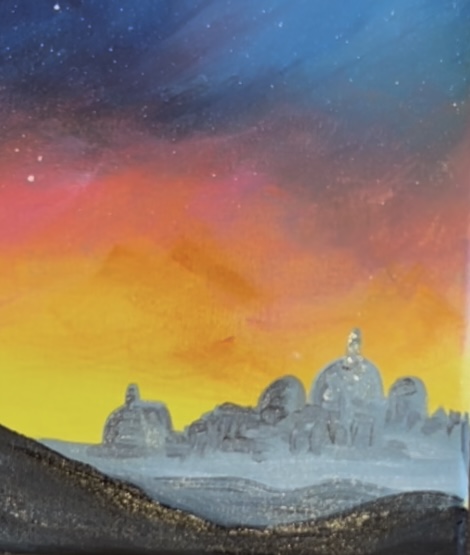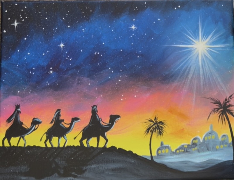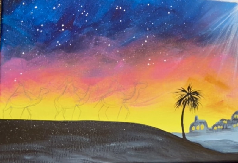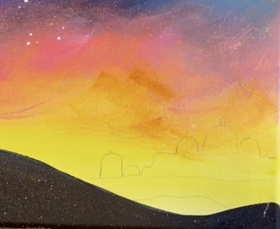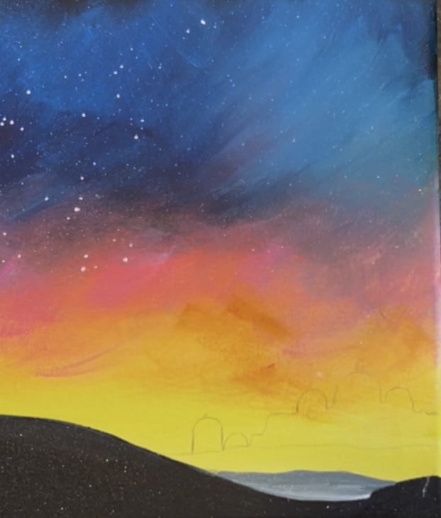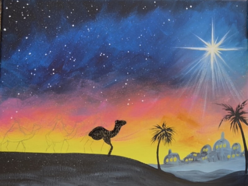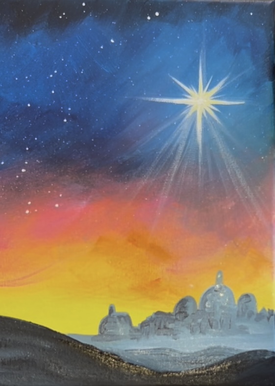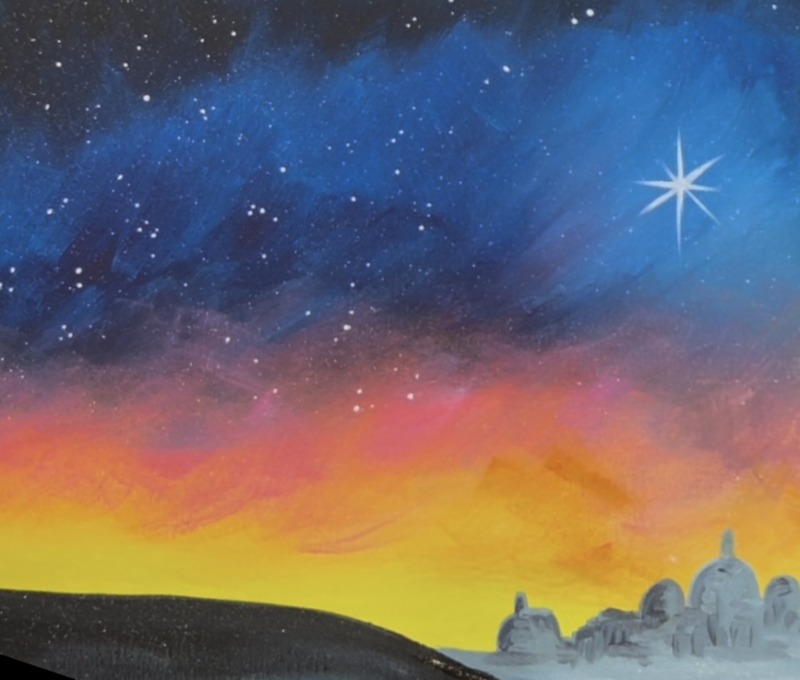 Some final touches for this painting can be: adding smaller pointed stars throughout the sky, adding thin white outlining on the town of Bethlehem (just along the edges of the shape) for an added “glow” and another bright white layer on the Christmas star.
