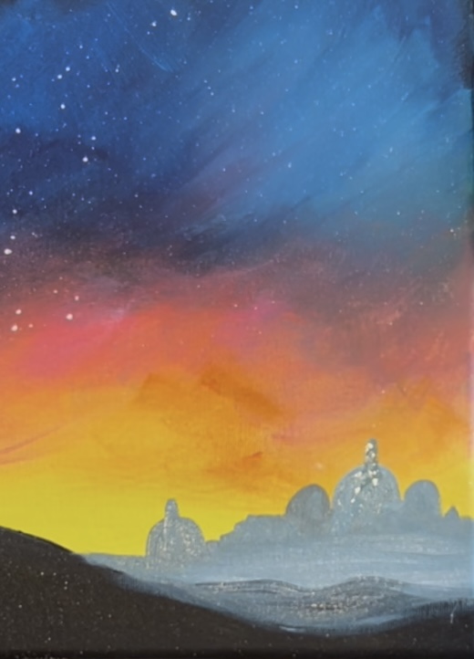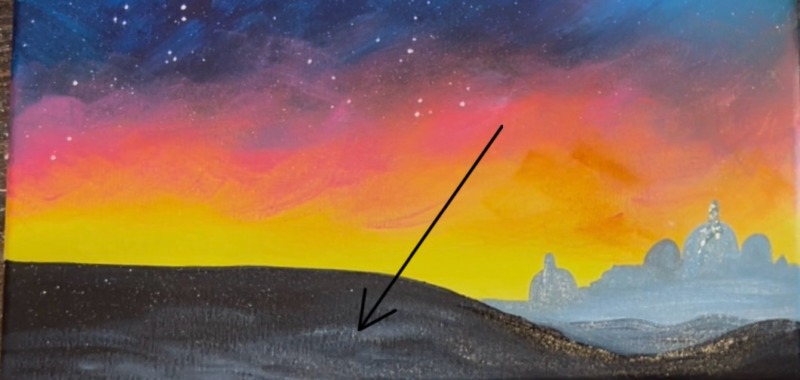 To paint the stars, use a toothbrush and titanium white (slightly watered down) to splatter little fine white specks. I did this all over the canvas, even over the bottom black land area. Then use the #8 “long round” brush (specifically the tip of the brush) to paint small white dots of clustered stars throughout the sky.