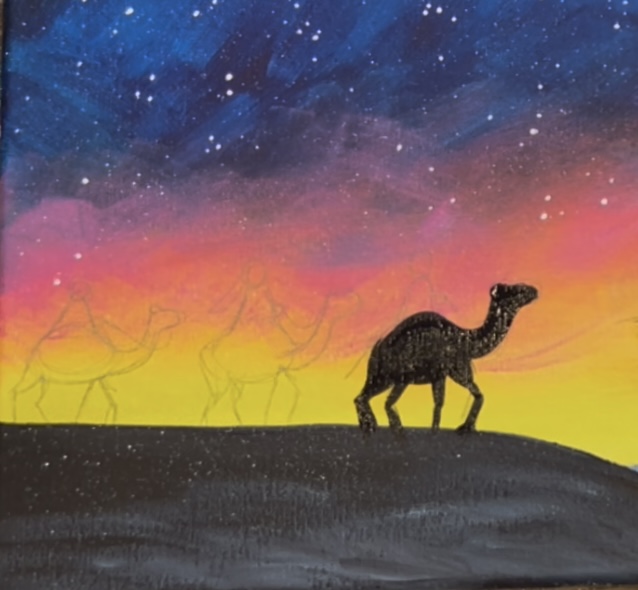 You can use the traceable template for this or hand draw! When I drew these, it was helpful to look at the silhouette template below. I’ll also give you steps for how to draw these. The camels and figures are broken down by simple shapes and lines and the legs can be drawn like “stick figures”. You can do a very basic sketch and then adjust when you paint the silhouettes.