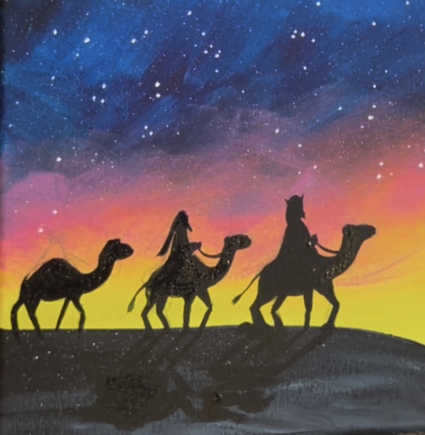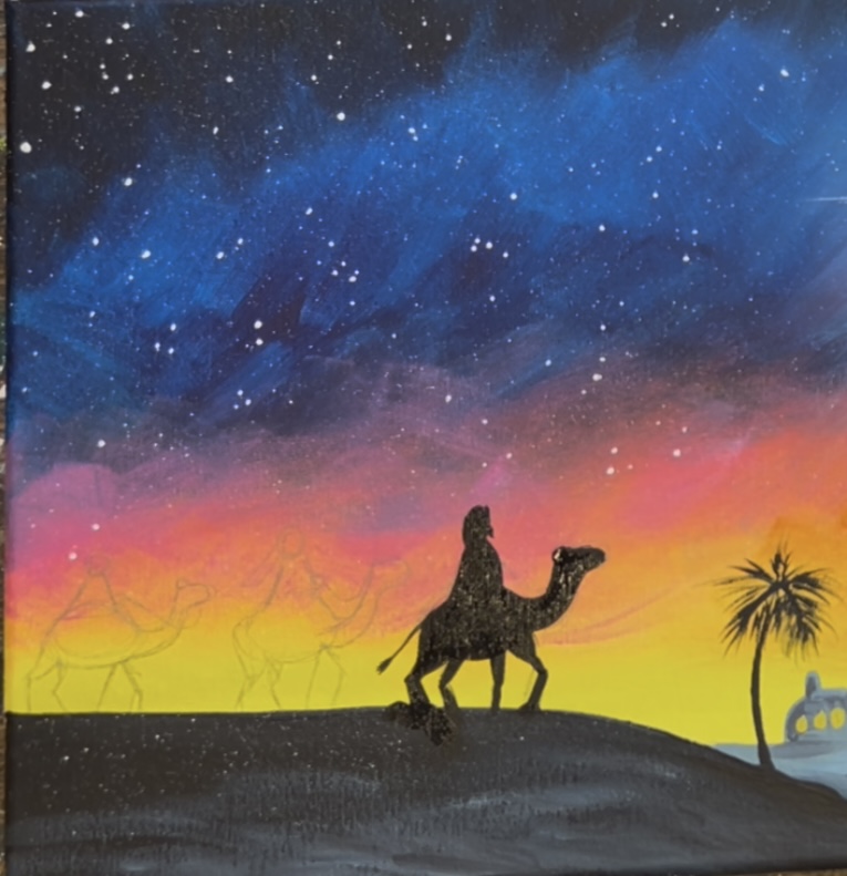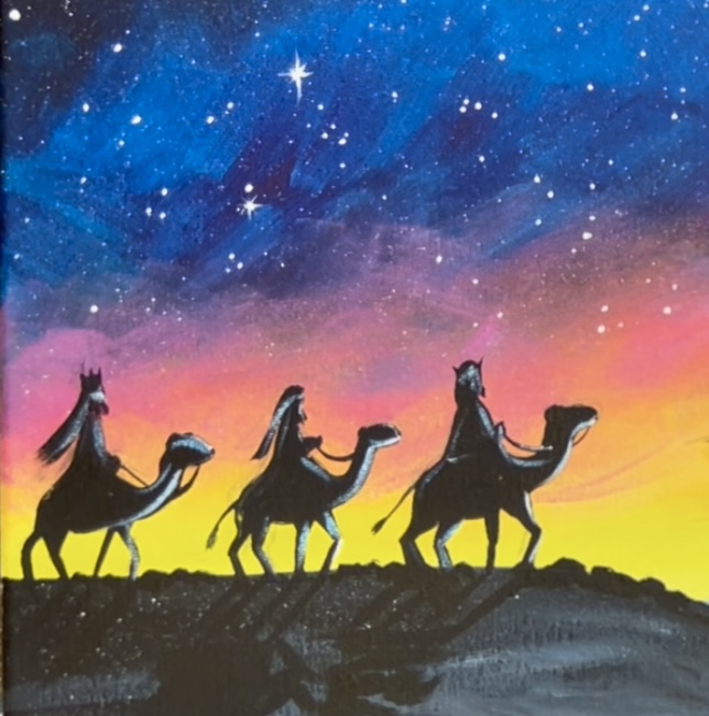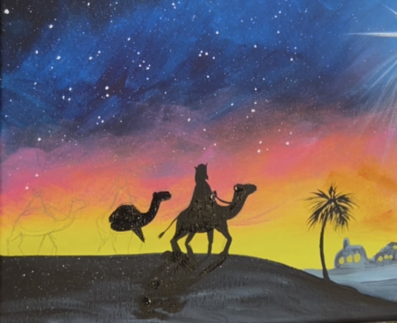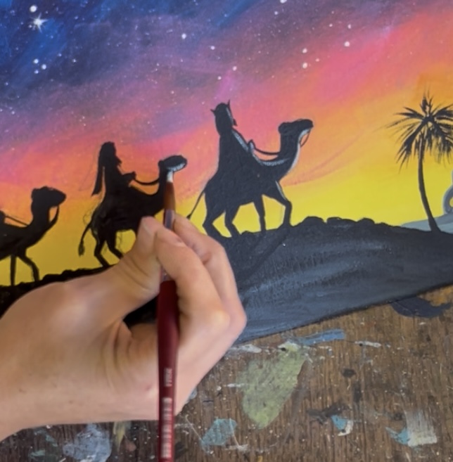 Use a #4 round brush and “mars black” to paint the camels and three wisemen in. Take your time with this step and do this with short paint strokes. Silhouettes are also very forgiving. So if it doesn’t look “perfectly proportional” that’s okay! Pay close attention to the curves and angles of the lines of the camels. Note that camel legs should look thinner on the bottom and slightly thicker at the top. Also, since the camel’s bodies were drawn as “ovals”, I painted them in to show more of the hump. Pay particular attention to how the camel’s neck curves upwards.