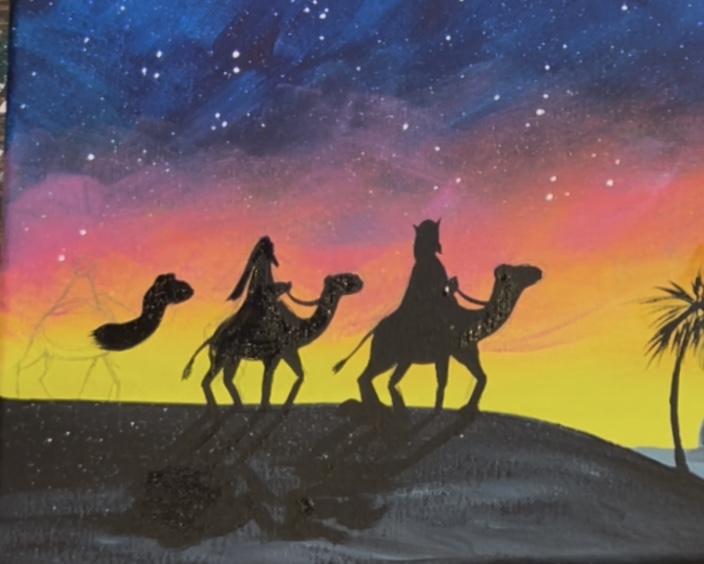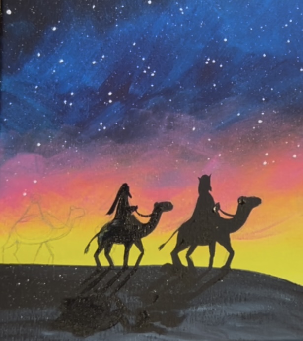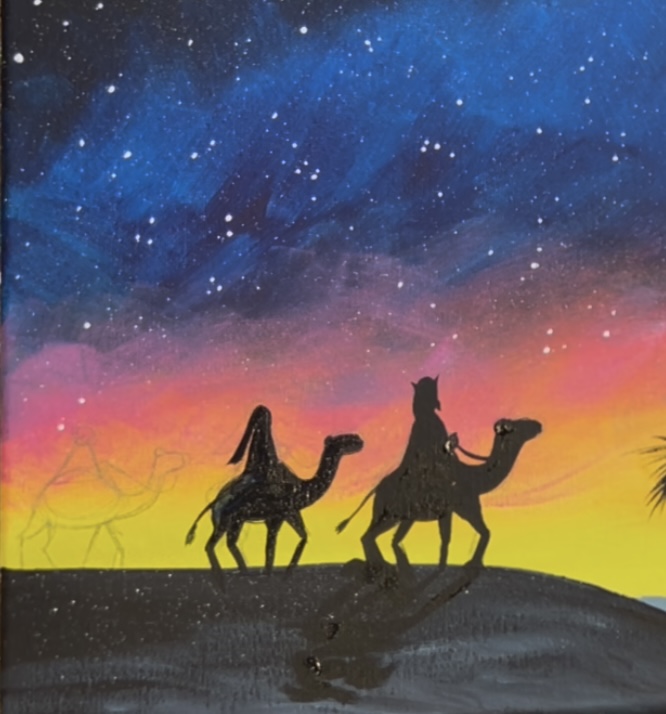 It’s okay if your drawing looks sketch-like. I kept most of the camels’ legs as stick figure-like and did not add much detail to the wisemen.