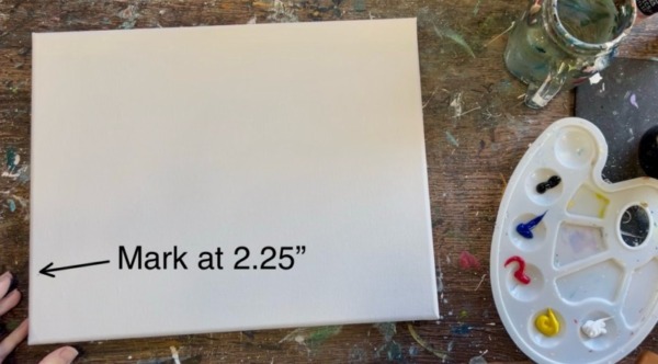 Start by measuring 2.25″ from the bottom of the canvas and making a little mark. If you are using a different size canvas, estimate about 1/5th of the canvas. This will be where the black shadowy silhouette land will start and where the three wisemen will be. We want to ensure this area above this mark will have bright colors so that the silhouette will stand out.