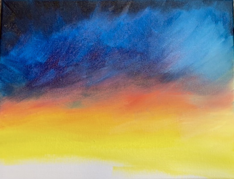 Rinse the brush. Next, you will be introducing the blue in the sky but make sure you do this very gradually. “Phthalo” blue is a dark, strong color that can take over fast if you add too much to the brush. Add only a small amount and blend it with the primary red. Do this very slowly and gradually. It will make a dark purple area where the blue and red blend. Work the canvas a bit more by painting angle/ choppy brush strokes. Try using just the dry brush to help the colors blend.