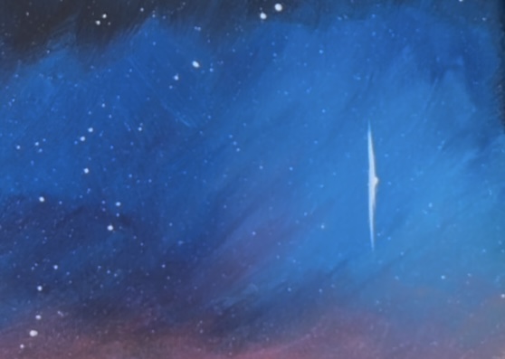 Load the brush into white and then wipe the brush. Paint more diagonal lines on the bottom of the star that extend towards the town. These lines should be translucent and not super bright. You create this effect by using the “dry brush” technique.
