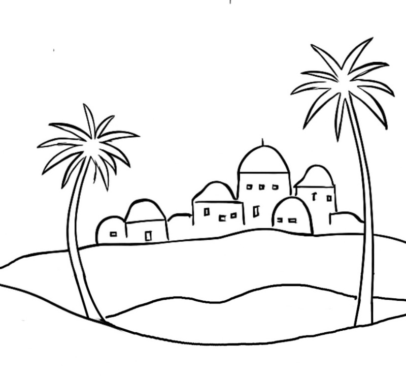 Use a pencil to sketch the town of Bethlehem. This is in the distance in the area where the hill dips down. There is also another small hill line between the front black land area and the town. Draw this line in as well!