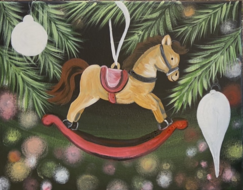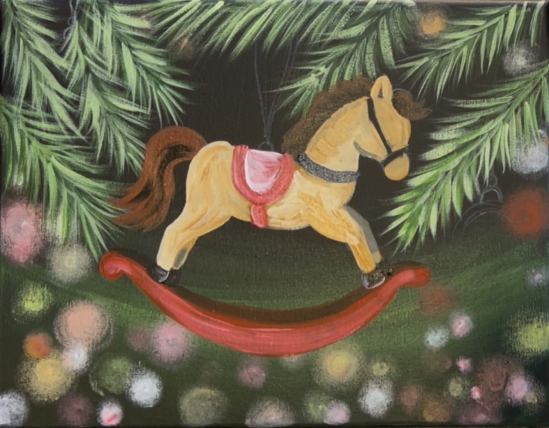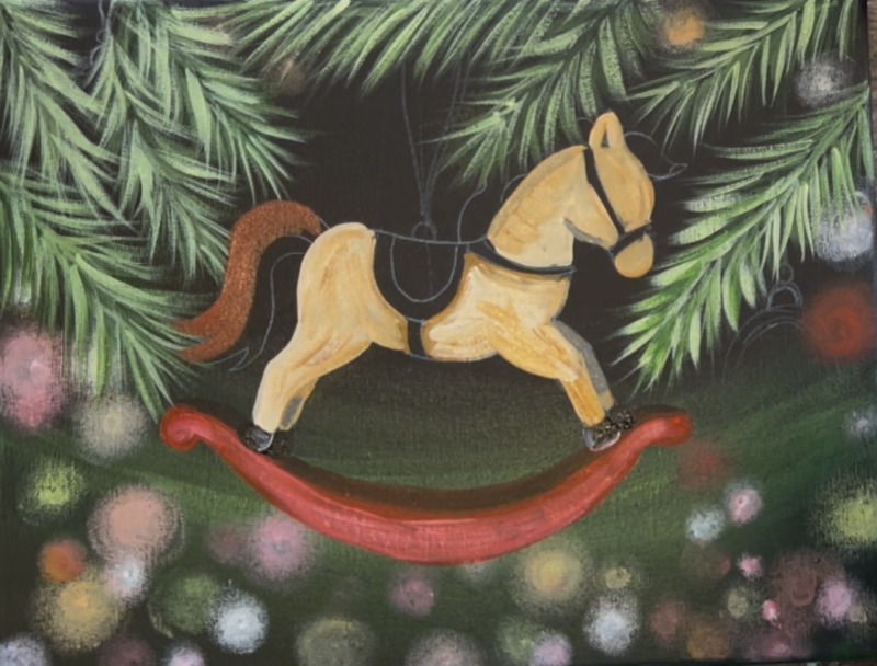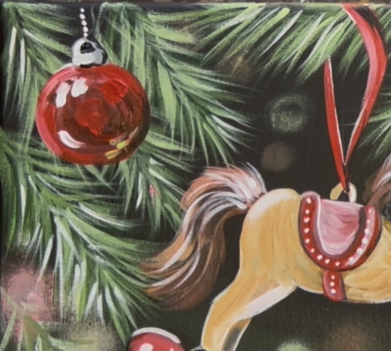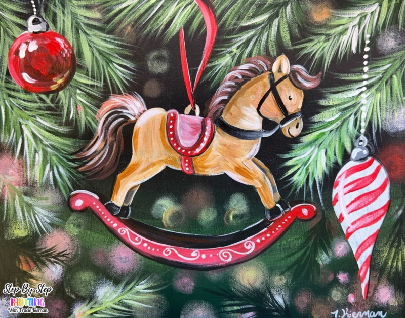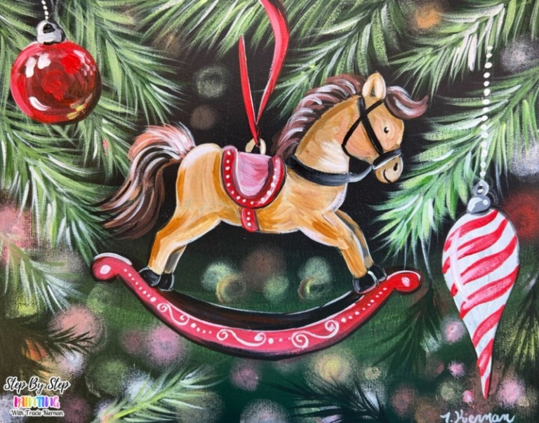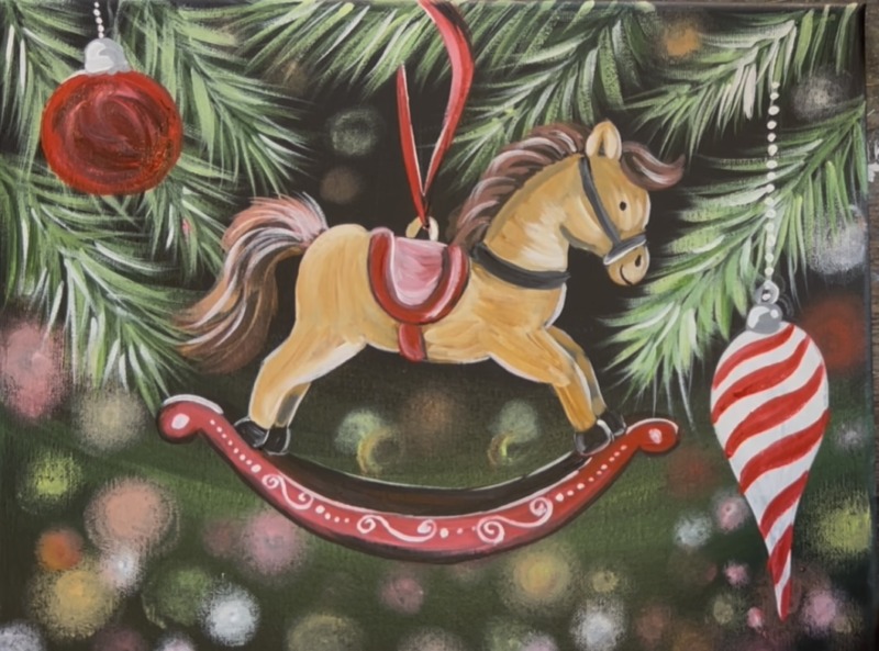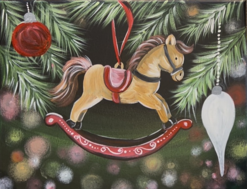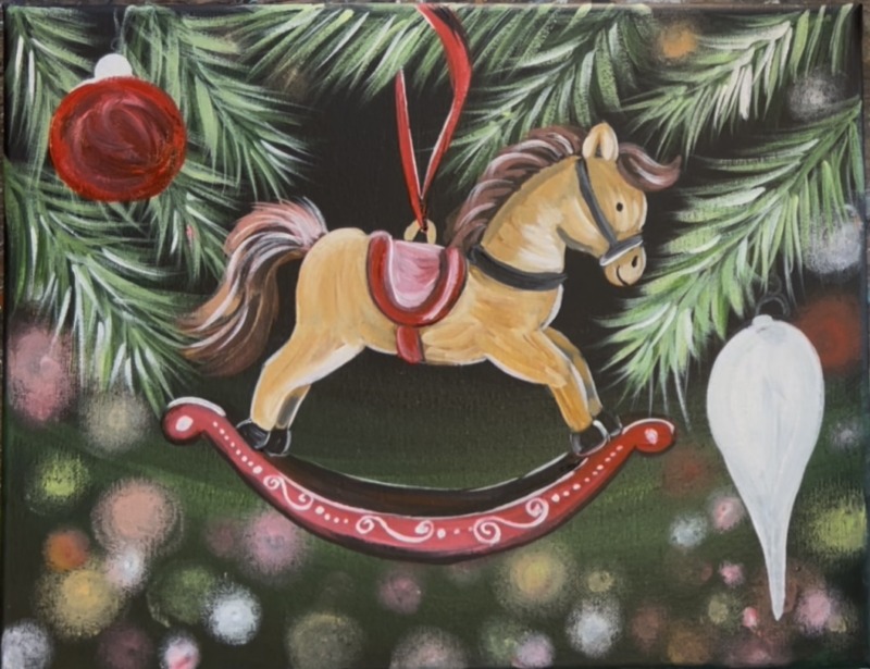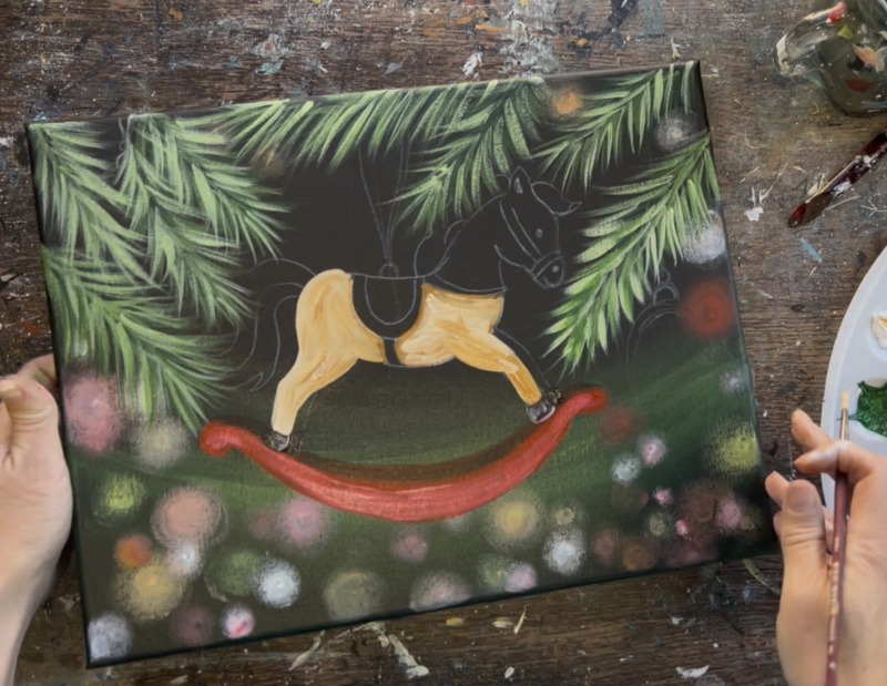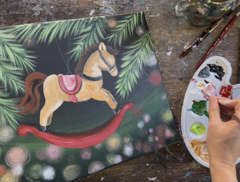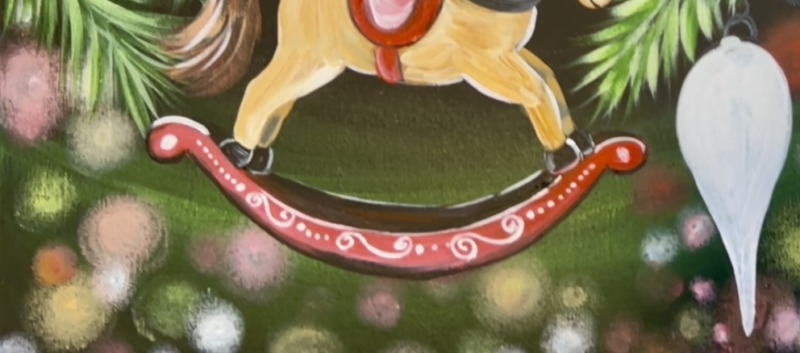 In this beginner acrylic painting tutorial, you’ll learn how to create a charming Christmas rocking horse ornament on a black canvas surrounded by festive evergreen branches, bokeh lights and holiday decorations.