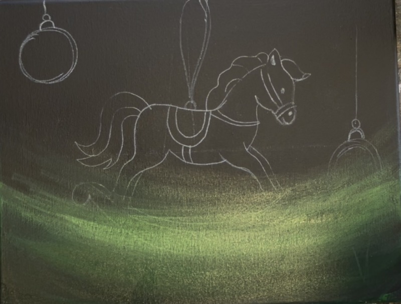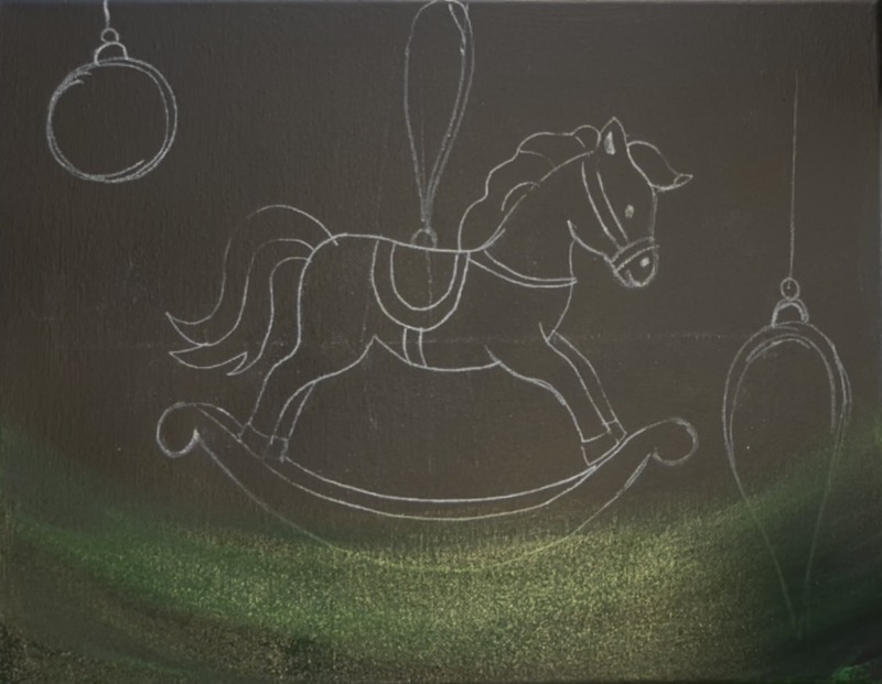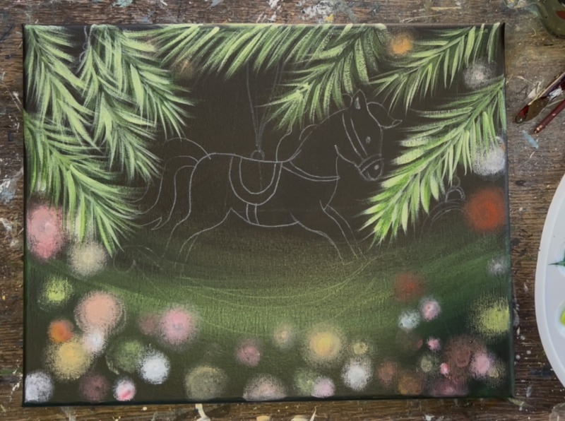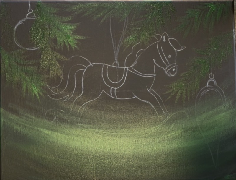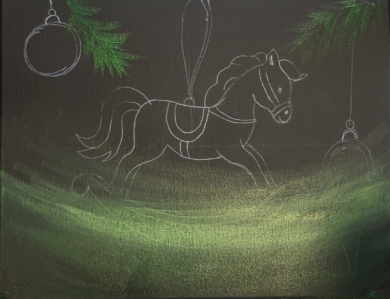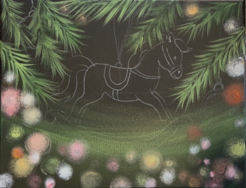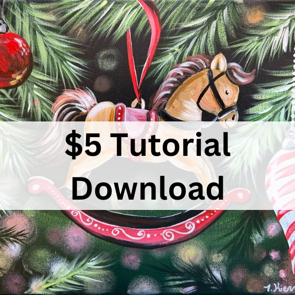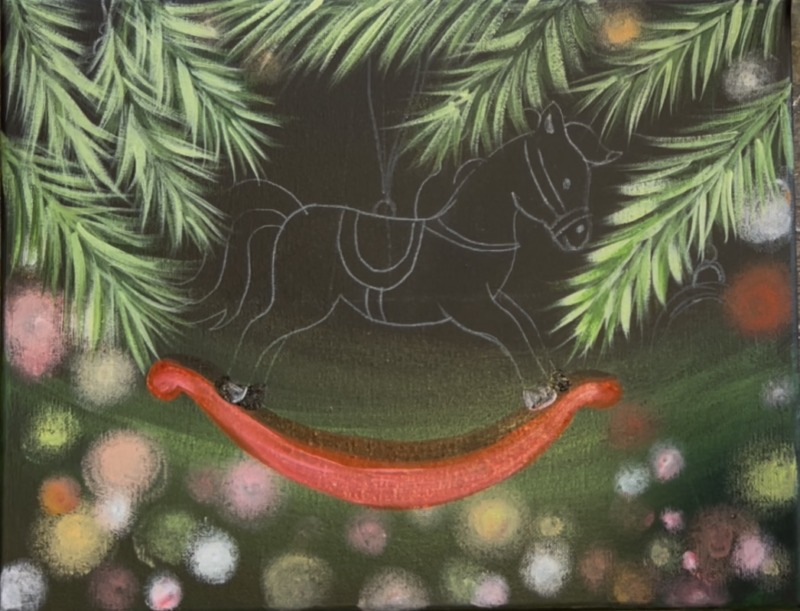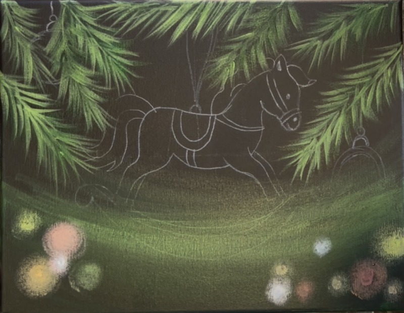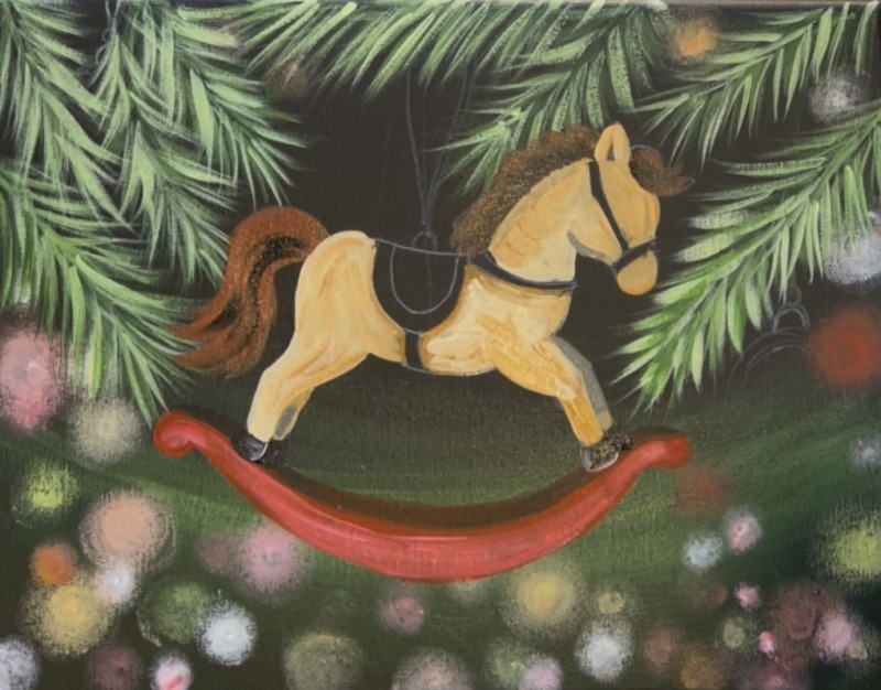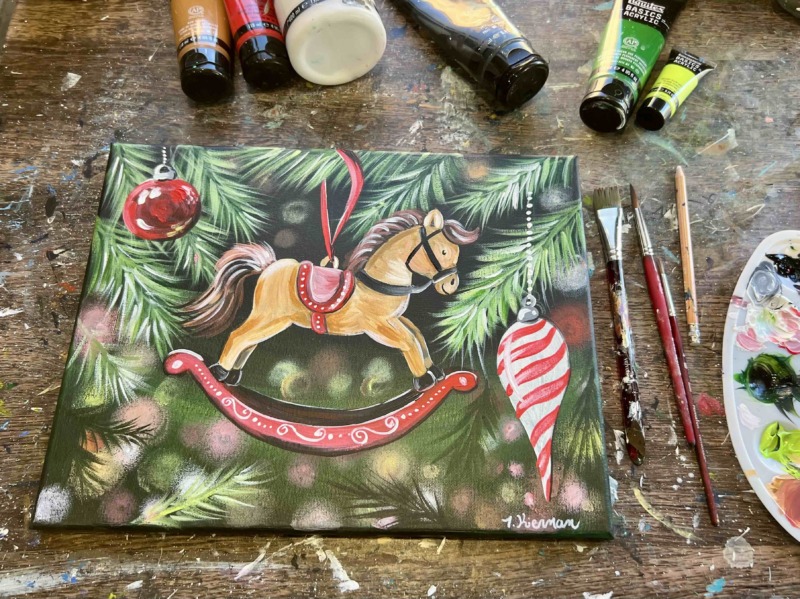 In this beginner acrylic painting tutorial, you’ll learn how to create a charming Christmas rocking horse ornament on a black canvas surrounded by festive evergreen branches, bokeh lights and holiday decorations.