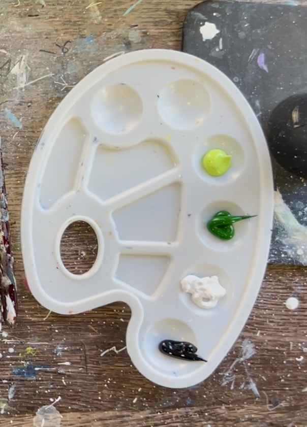 Load your palette with the colors: brilliant yellow green, hooker’s green hue, titanium white and mars black.