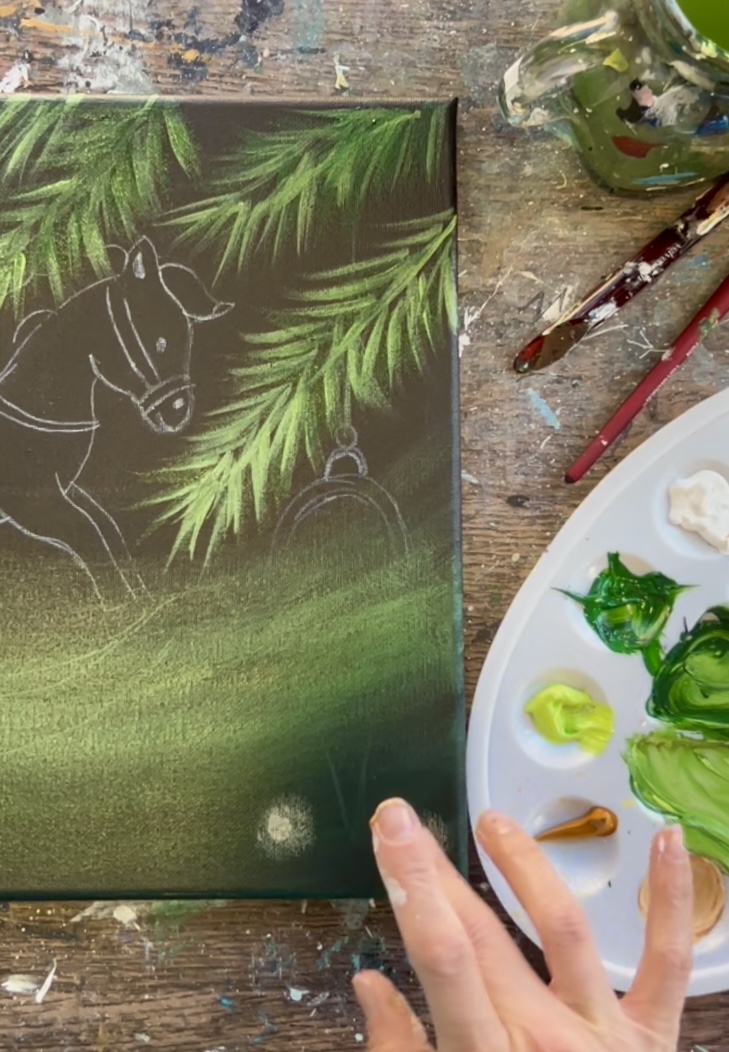 Start each branch by painting a green line for the “stem”. Then, at the end of the stem, paint individual diagonal lines for the pine needles. Make each branch so that it is pointing towards the horse and all around it.