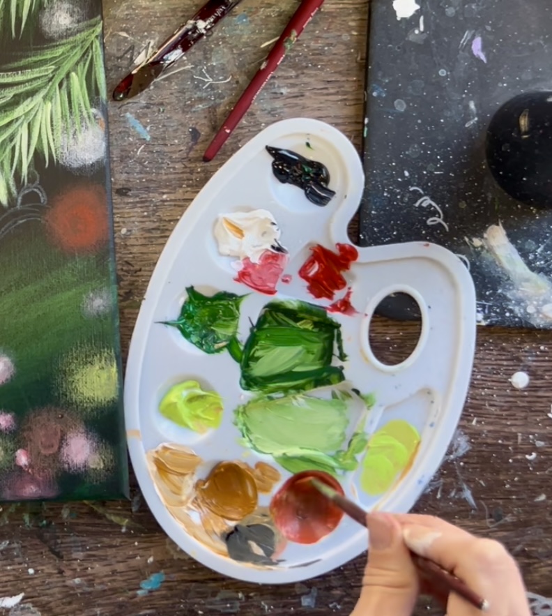 Load “cadmium red medium hue” on your paint palette and paint some bokeh using the red! Most of these lights are on the bottom half of the painting (over the green layers of paint we added earlier). There are a few lights scattered in between the branches at the top and sides of the paintings, however, most are on the bottom.