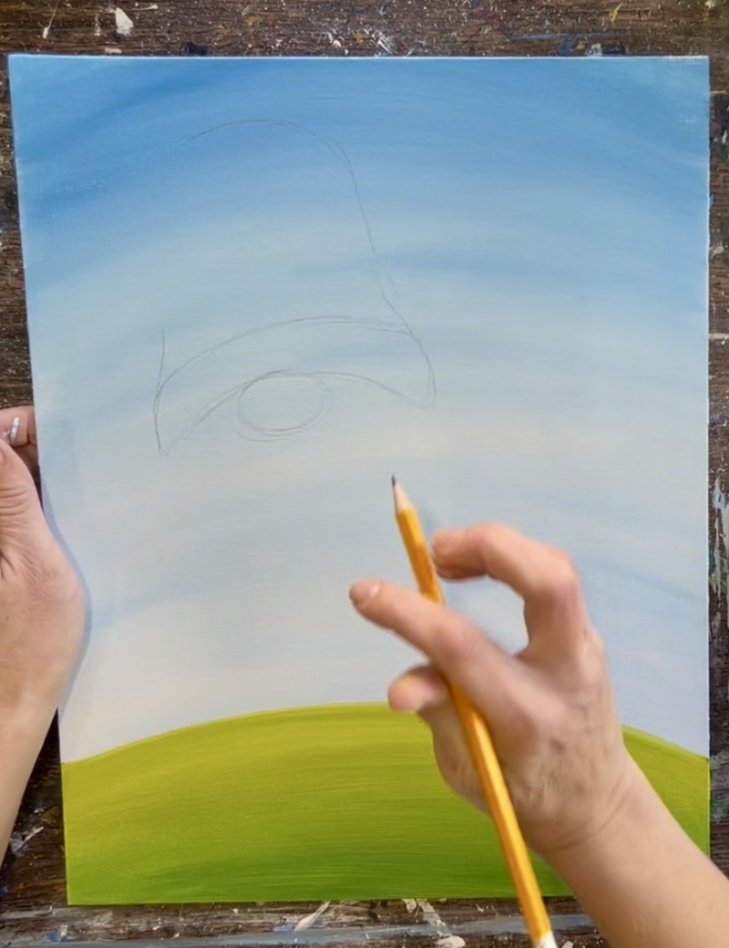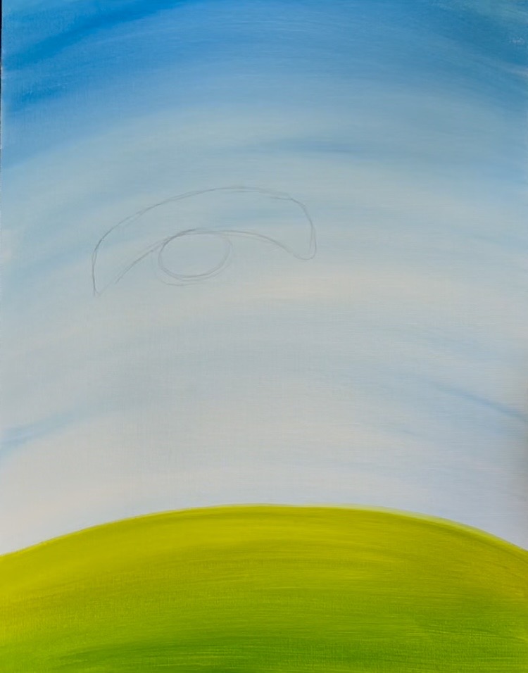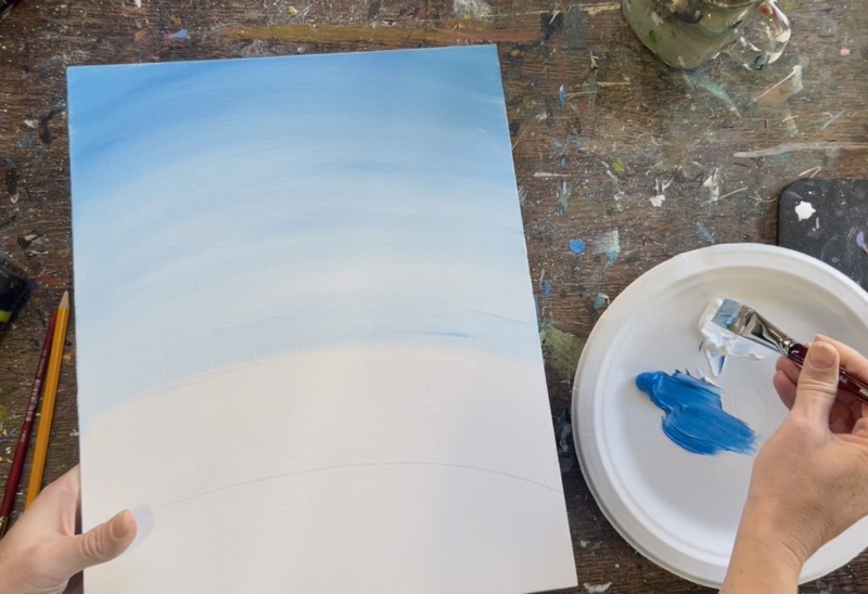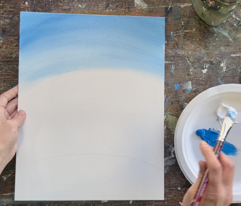 Load your paint palette with the two colors: “cerulean blue” and “titanium white”. Use a 3/4″ flat wash brush to mix equal parts both of those colors together. Start at the top and paint large, curved paint strokes that go parallel to the hill line you drew.