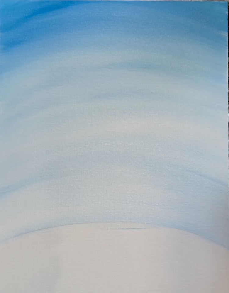 As you paint the sky and work your way downwards, add more “titanium white” to the brush and blend up into the darker blue in the sky. You want a gradient of dark at the top and light on the bottom. Make the sky very light, especially in the middle and bottom!