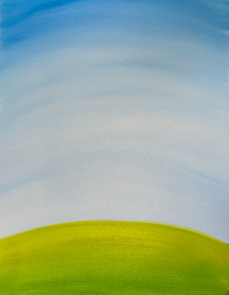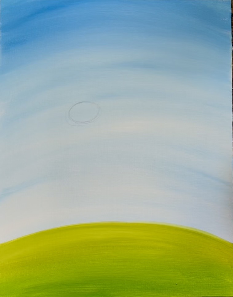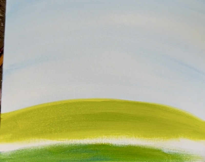Then mix the “light olive green” with “cerulean blue” on your paint palette. This will darken the green. Paint this darker green on the bottom of the canvas and blend it up into the lighter part of the hill. Create a gradient of light to dark green. This creates a little bit of “perspective” in the hill.